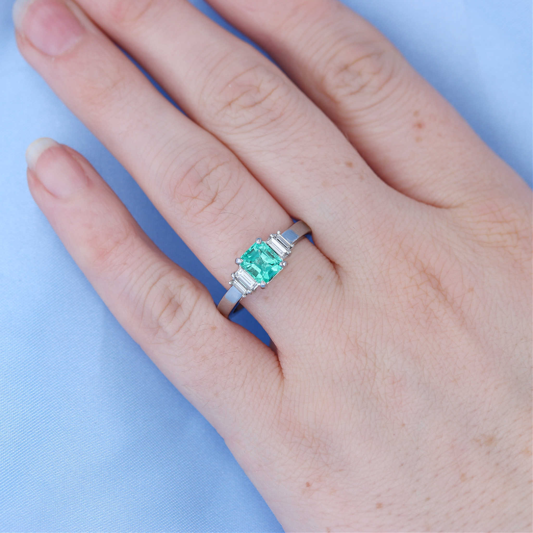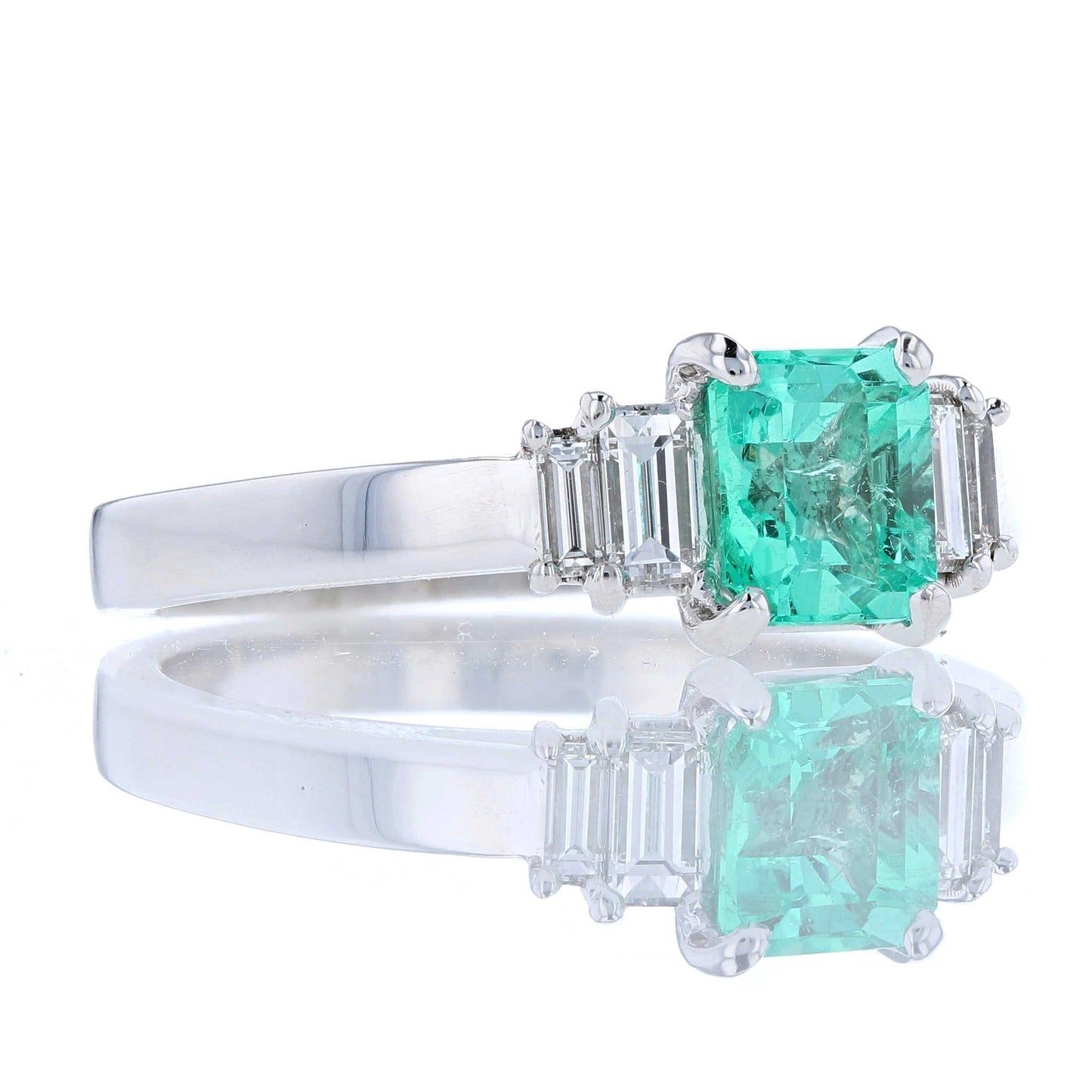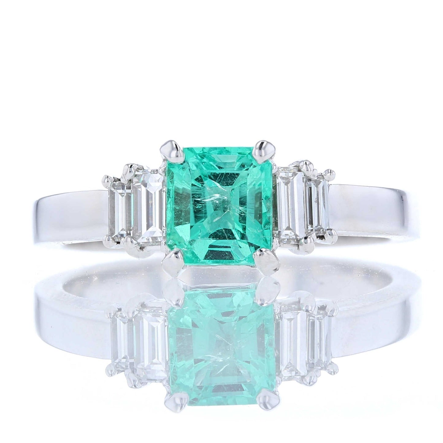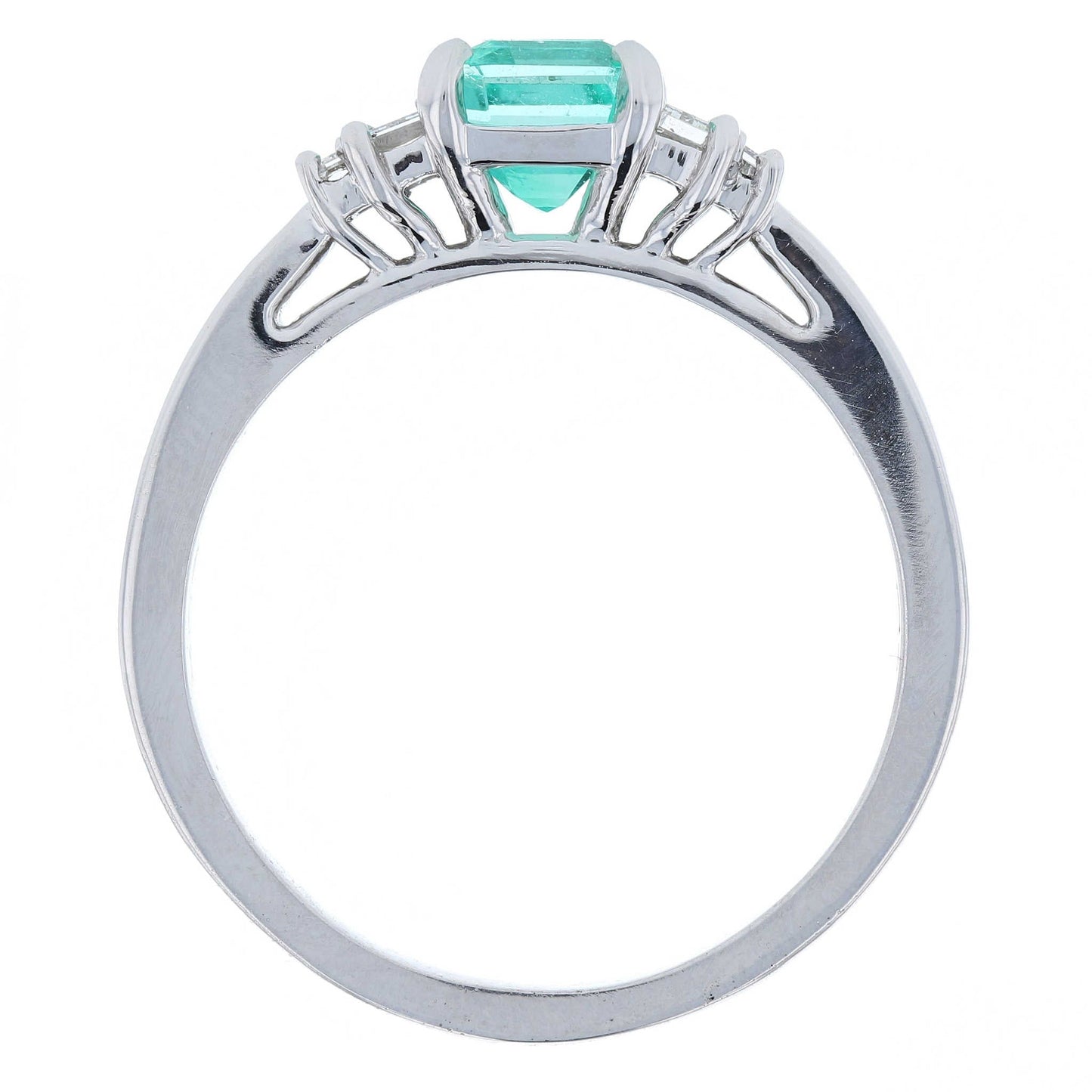 C132429An emerald cut emerald is hugged by tapering baguette diamonds, set into a 18 karat white gold 2.5mm band.