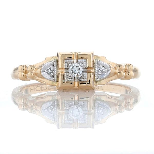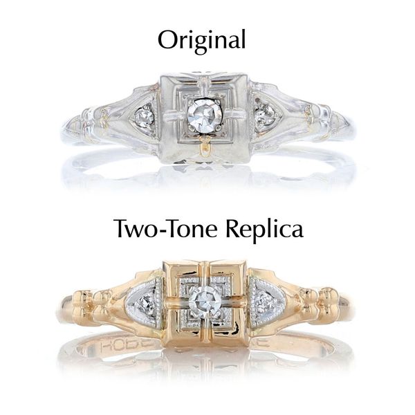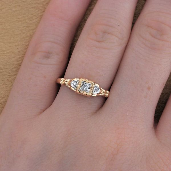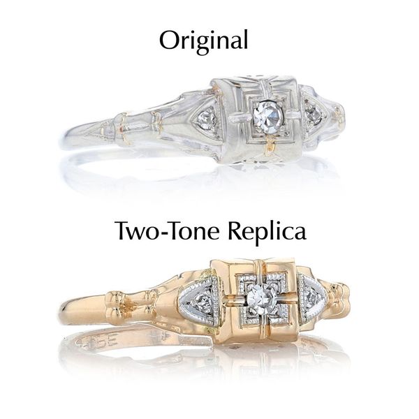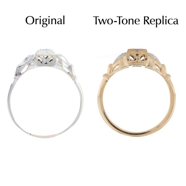 Our client had an antique white gold ring, and he wanted it in yellow gold. We remade a replica with a durable shank in 18kt yellow gold, and set his original diamonds into the new ring. On the inside is engraved, "Faith Hope Love."