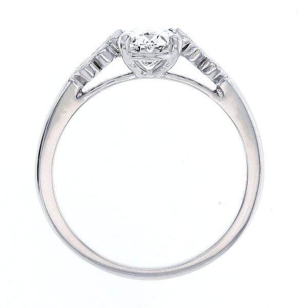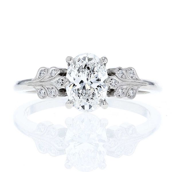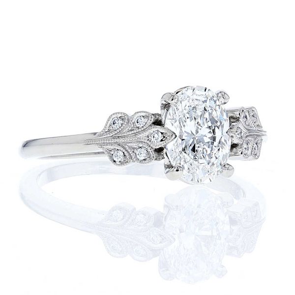 C99974This platinum Art Nouveau inspired ring features an oval lab created diamond and leaf-shaped milgrained floral accents.