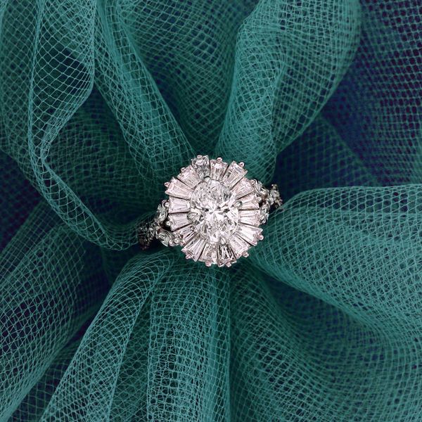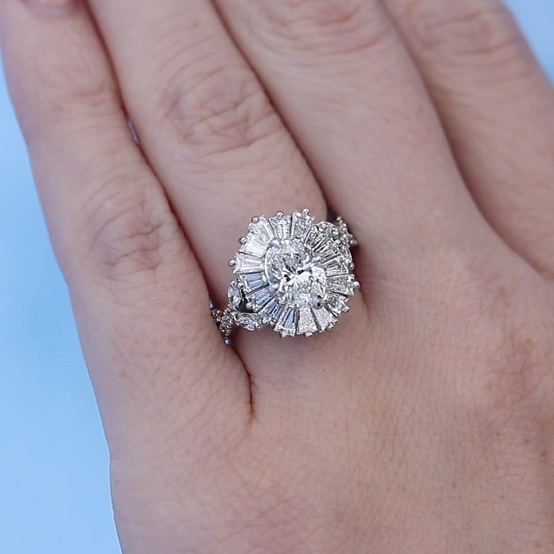 C107648This custom all-lab-grown-diamond ring features an oval cut center, surrounded by custom cut tapered baguette cuts in a ballerina tutu-style halo. The baguettes are angled, to catch the light one at a time like piano keys, in the style of vintage cocktail rings. The shank is inspired by twisting vines, with marquise lab diamond leaves.