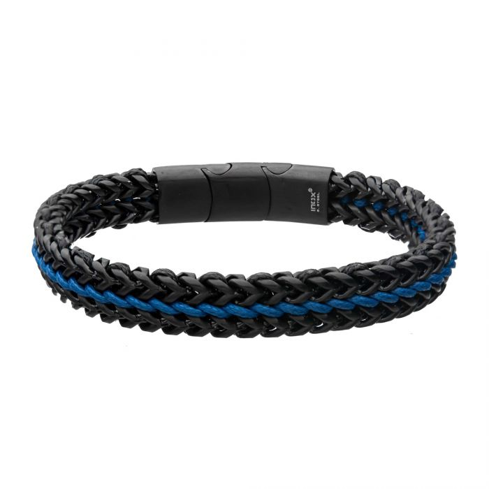 Stainless Steel Black Ion Plated Blue Cord Foxtail Chain 7.75-8.25" Adjustable Link Men's Bracelet with Magnetic Clasp.