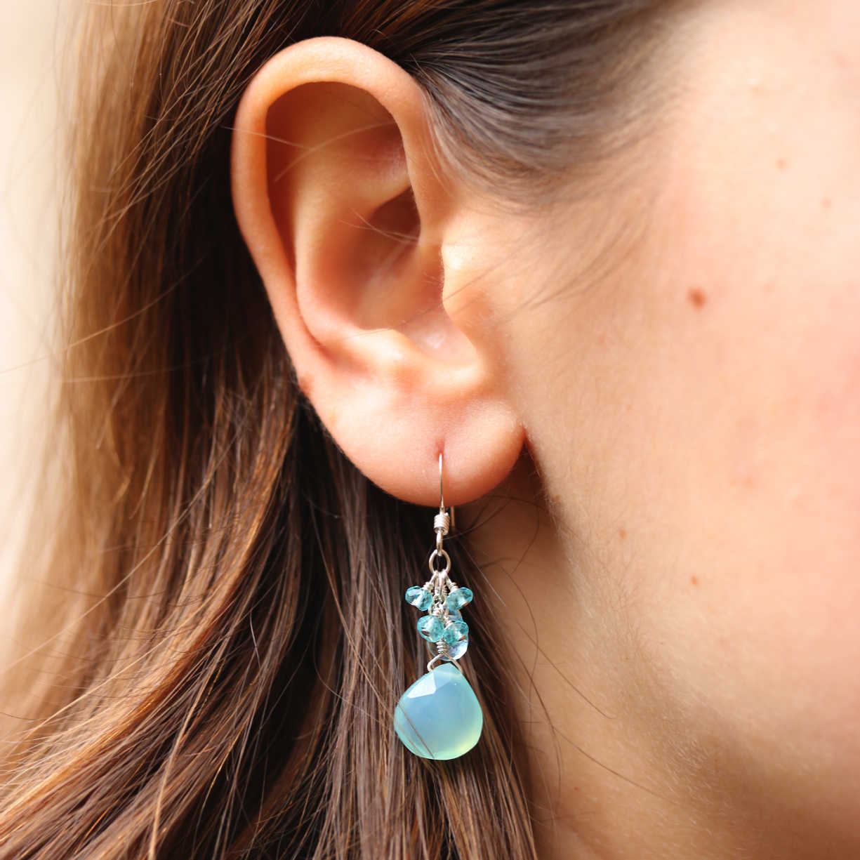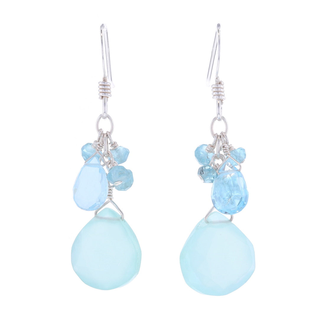 Sterling Silver Dangling French Wire Briolette Earrings with Blue Topaz and Chalcedony.