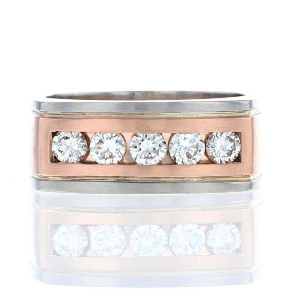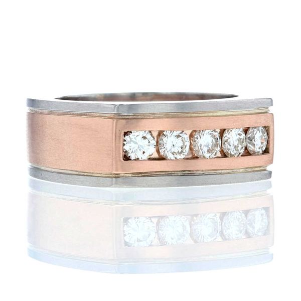 C98377Five diamonds are channel set into a euroshank rose gold band, flanked by platinum on either side. The band has a brushed finish, so the color difference between the 18kt rose gold and heat treated platinum really pops!