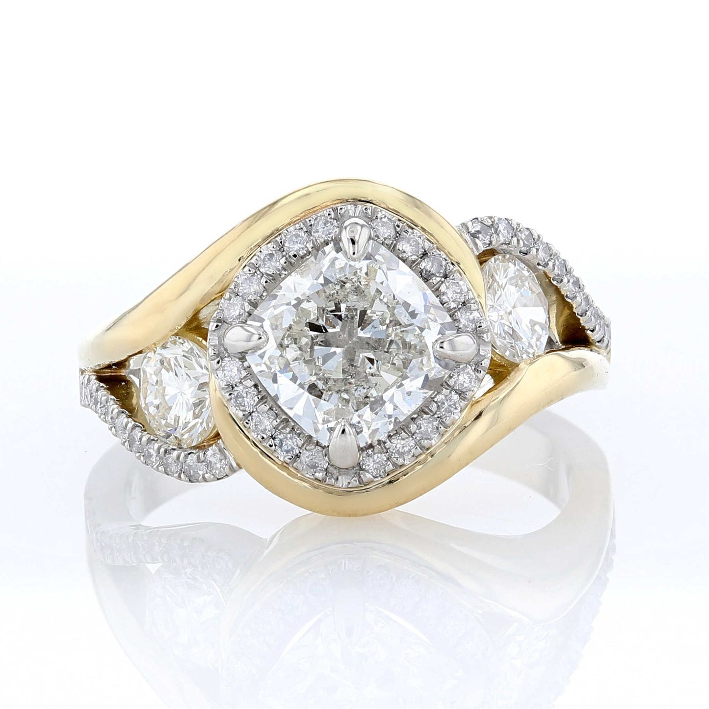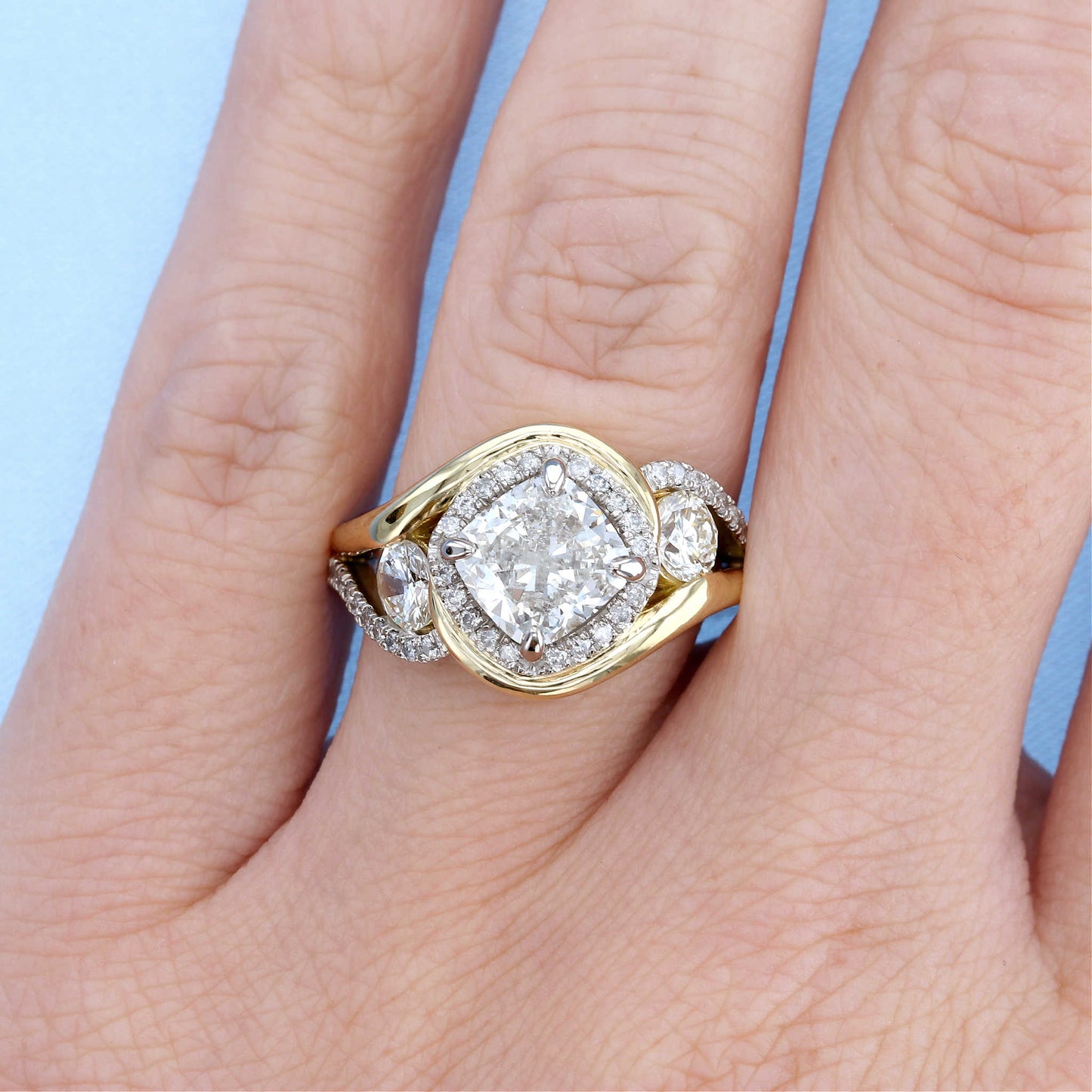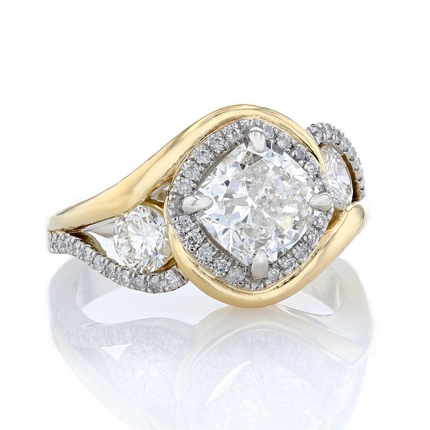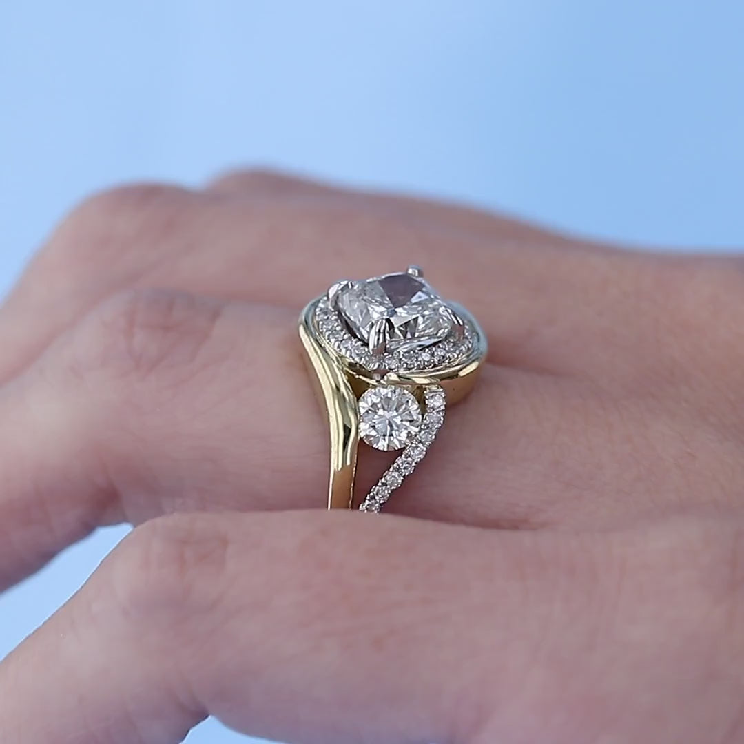 C108837Ribbons of diamonds and yellow gold curve, creating a sparkling halo around the cushion center diamond and an eye-catching bypass design. Accented with two larger round brilliant cut diamonds, this ring is a showstopper in platinum and yellow gold.