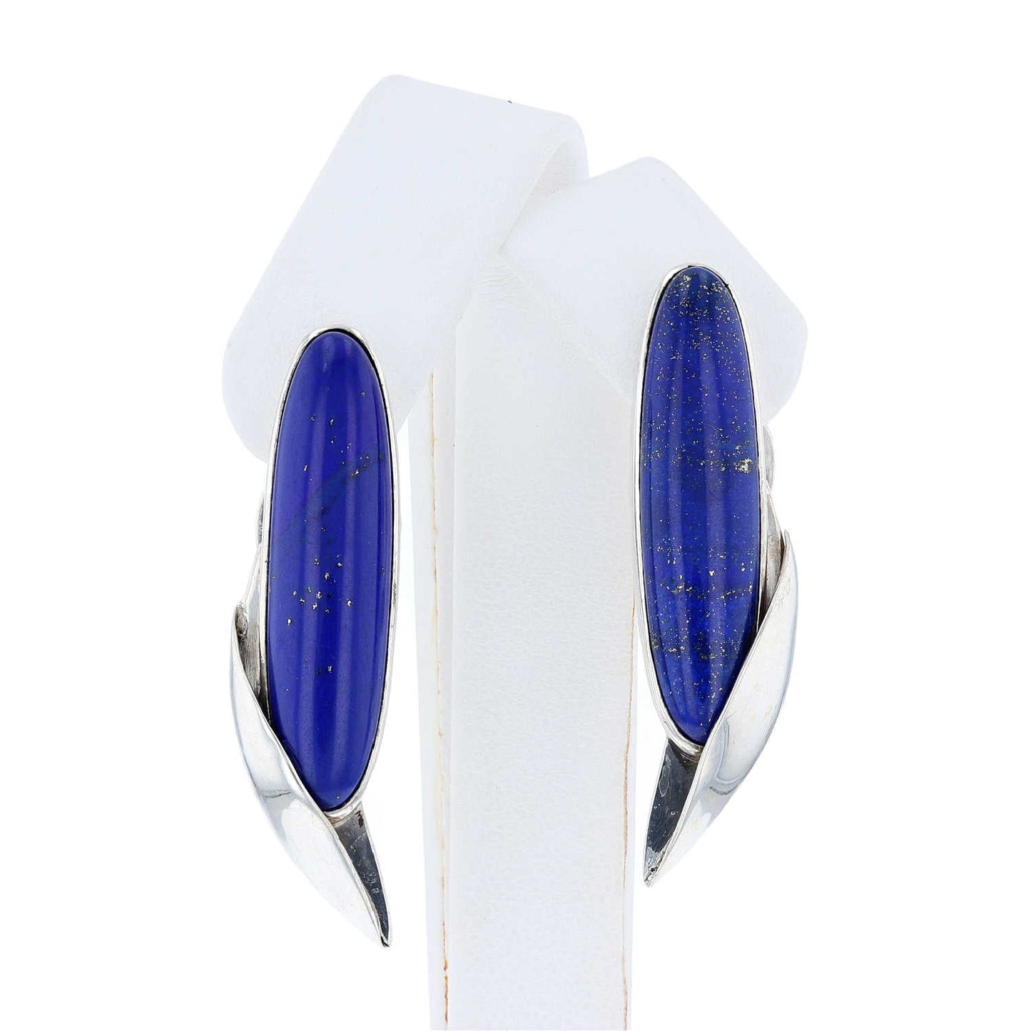 C72967Elongated oval lapis are bezel set in sterling silver, with an offset silver detail to create these contemporary earrings.