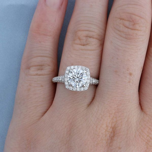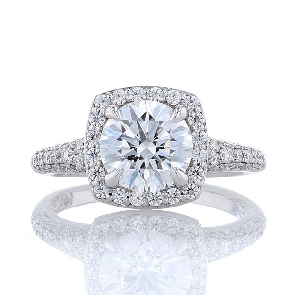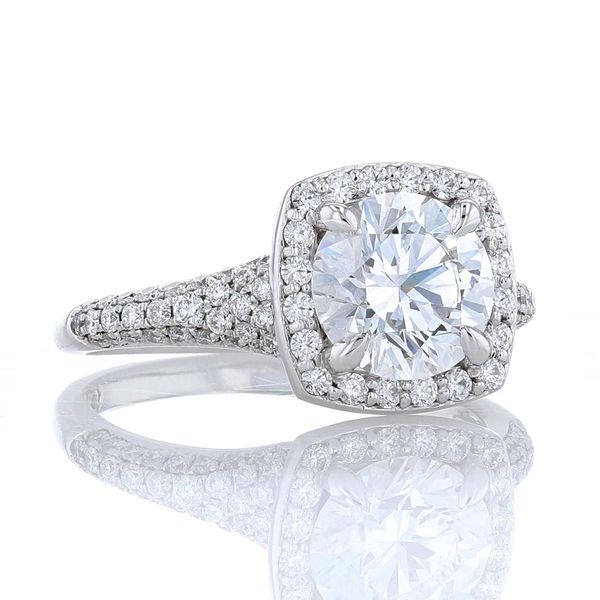 R107706This 18k white gold ring has diamonds set pave-style in a tapering shank, and in a cushion shaped halo. For the center, our client selected a 1.57ct lab created D VVS2 round brilliant cut diamond.