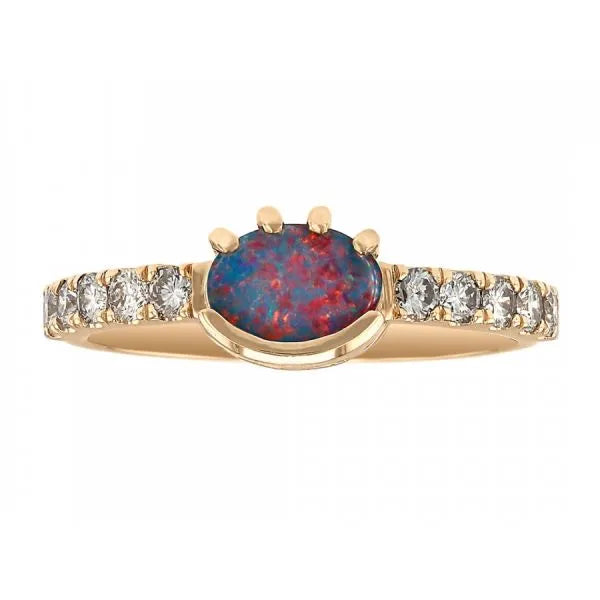 92080Custom is all about making a piece that's totally you! This opal is set east west with a partial bezel on one side and prongs on the other for a completely one-of-a-kind statement piece.