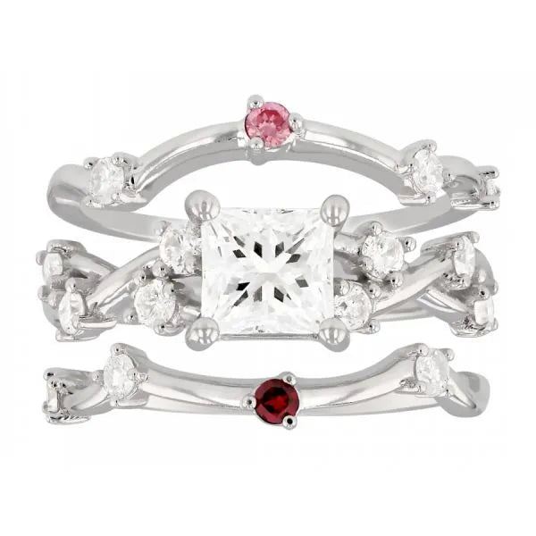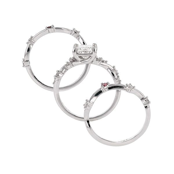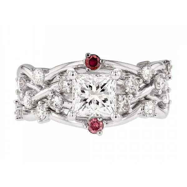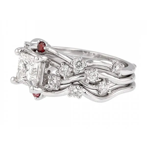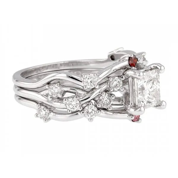 90878Branches of white gold extend from and wrap around the center diamond in this three ring wedding set. Red, pink, and white diamond accent stones sit like dewdrops atop the branches. This is an elegant organic design for the nature lover you love!