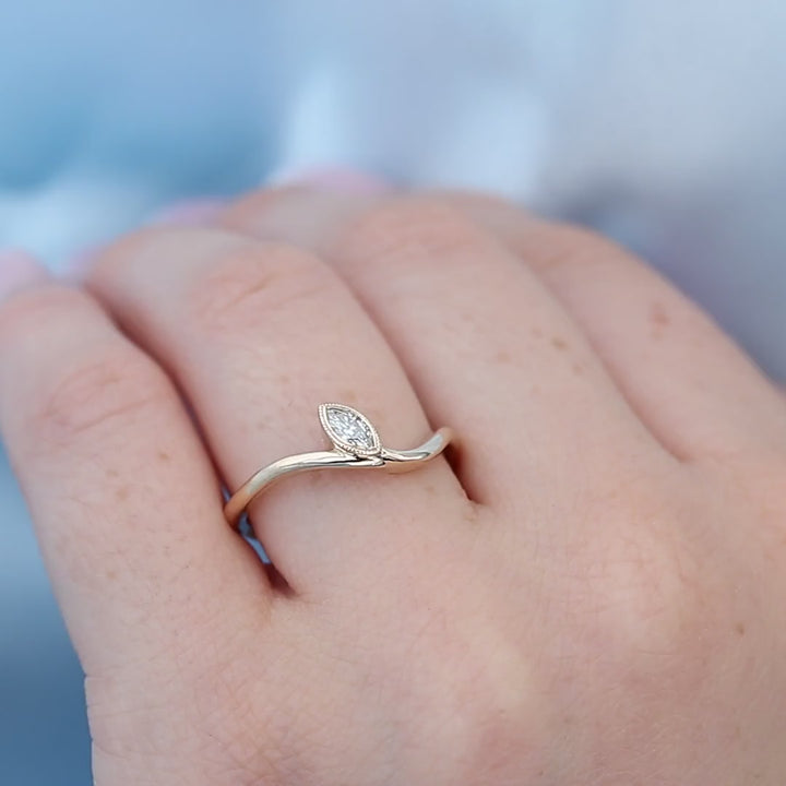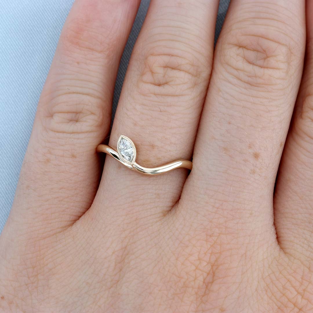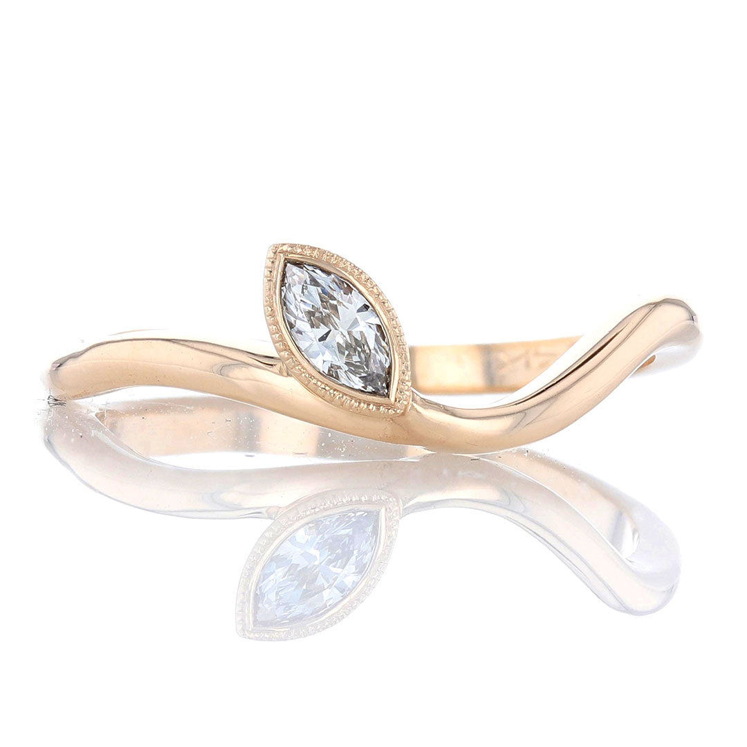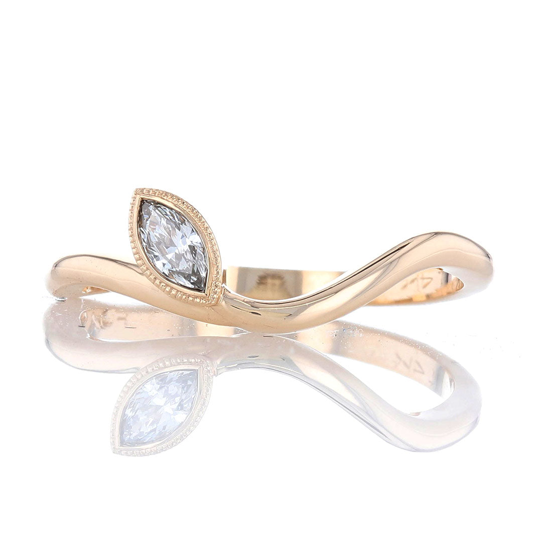 Branches of high polished yellow gold culminate in a leaflike marquise diamond, bezel set with milgrain. The wedding band curves to fit against the engagement ring.