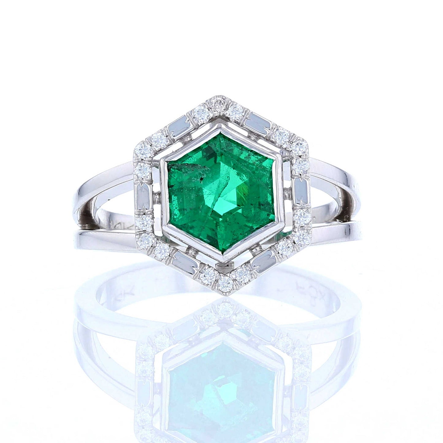 C141052The geometric ring features a vibrant bezel set emerald, surrounded by a hexagon halo of diamonds and white gold, in the center of a high polished split shank.