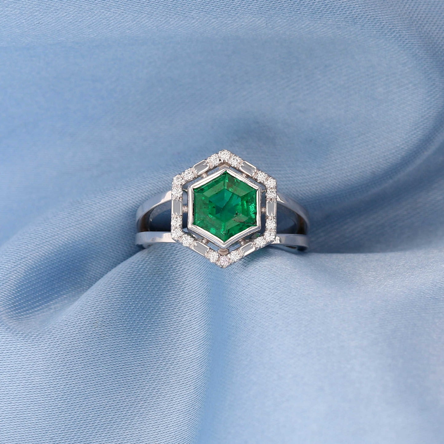 Hexagon Emerald Diamond Halo Ring