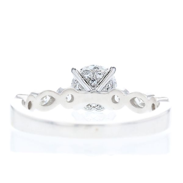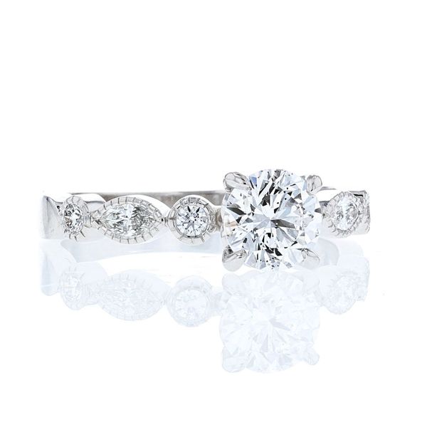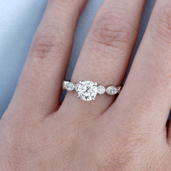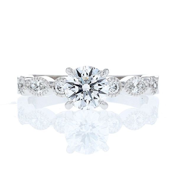 C103208This 14kt white gold romantic engagement ring with round and marquise diamonds, set in bezels with milgrain, has a special surprise: a hidden heart underneath the center diamond!