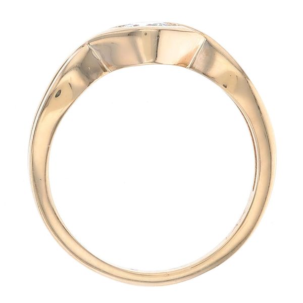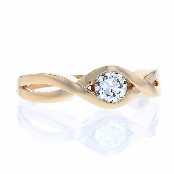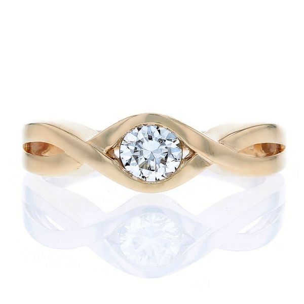 C99902This custom yellow gold solitaire has a half carat diamond set in the middle of an infinity design.