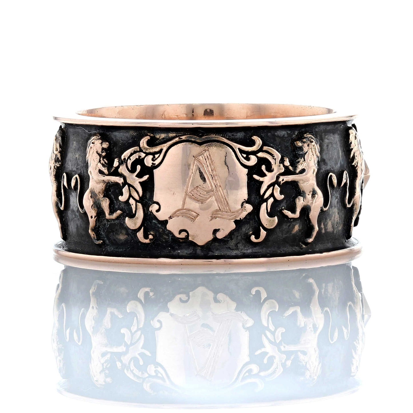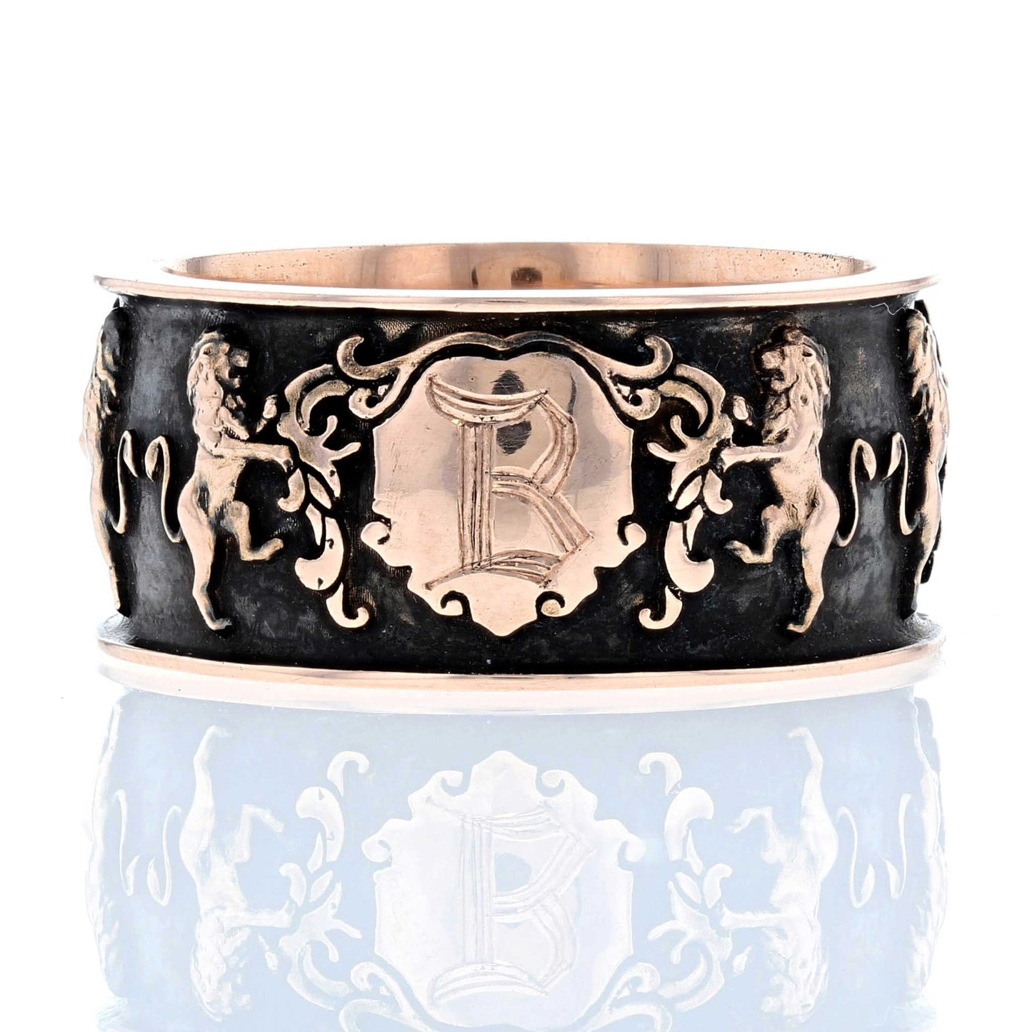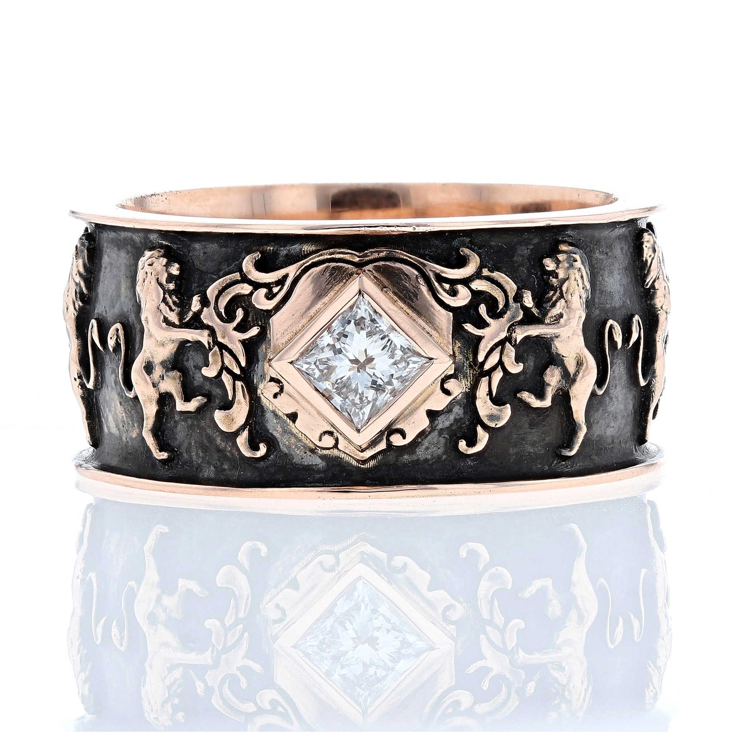 C121708This bold men's ring makes a statement with intricate details in rose gold. A princess cut diamond is bezel set on point and flanked by lions. Either side of the ring features an engraved shield and scroll crest engraved with an initial and continues the lion motif.