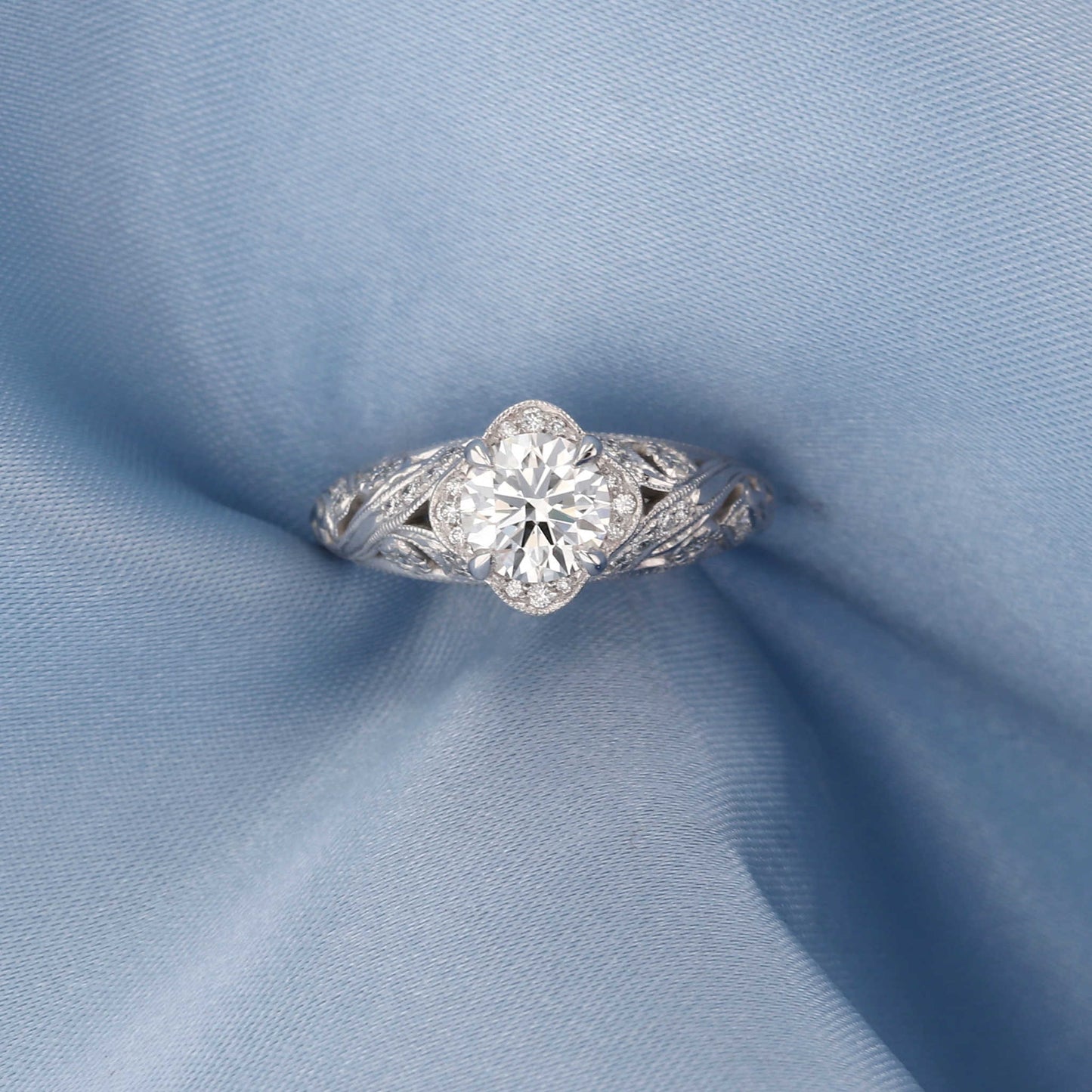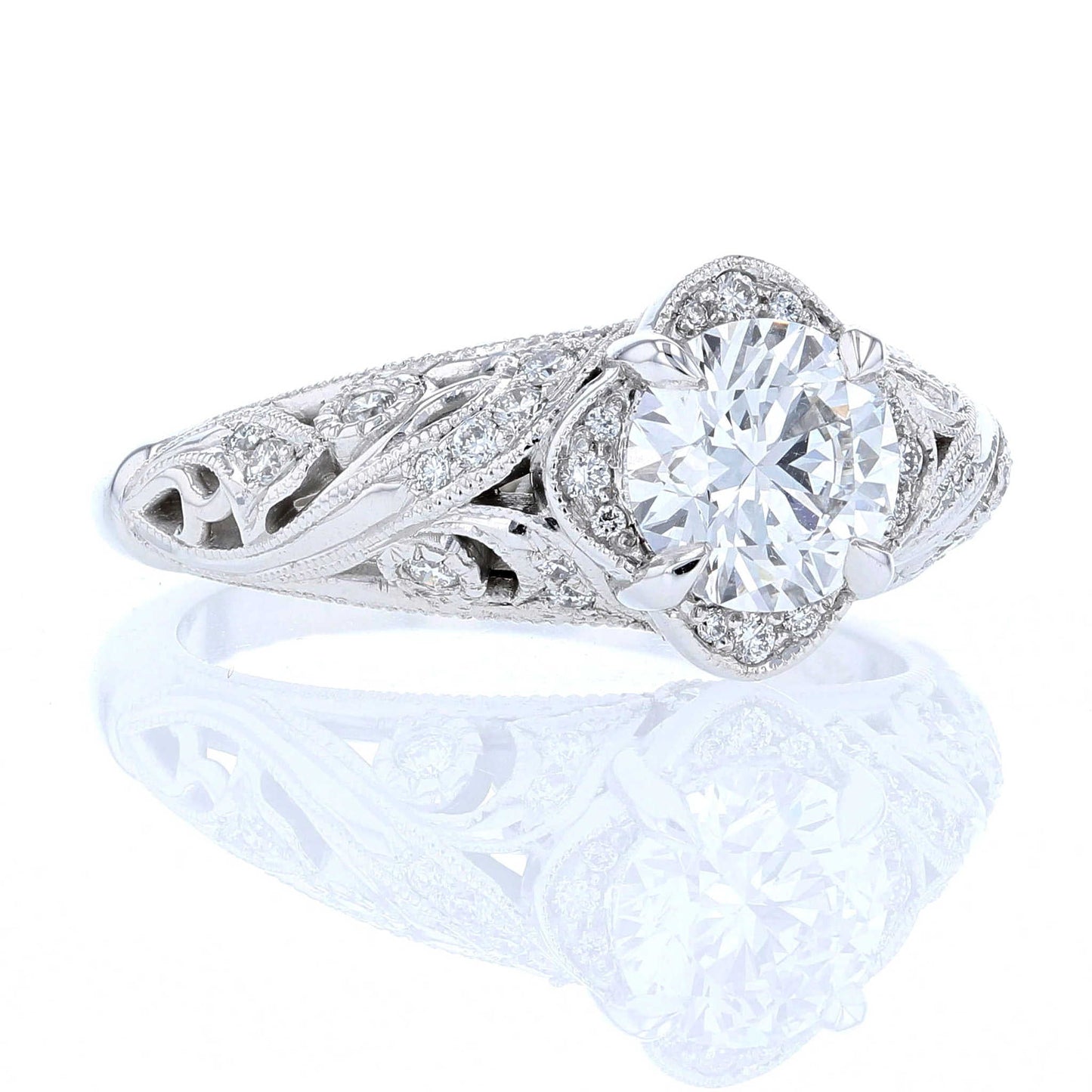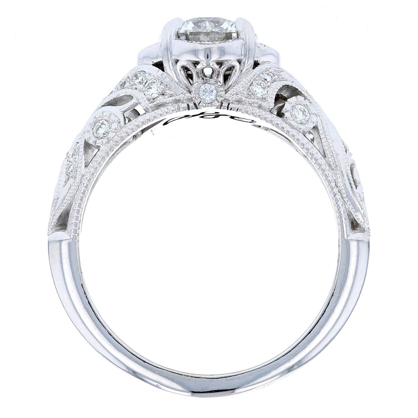 C135591This detailed engagement ring features a one carat center diamond wrapped in a scallop halo. The band is created from filigree and milgrain floral details, pave set with accent diamonds.
