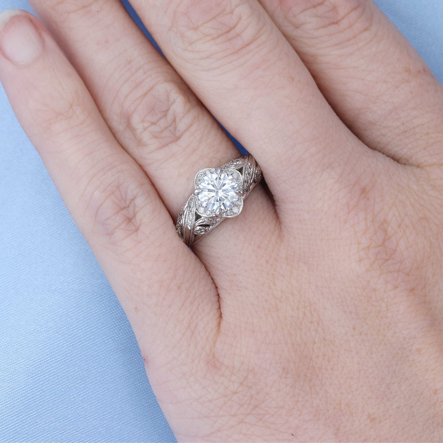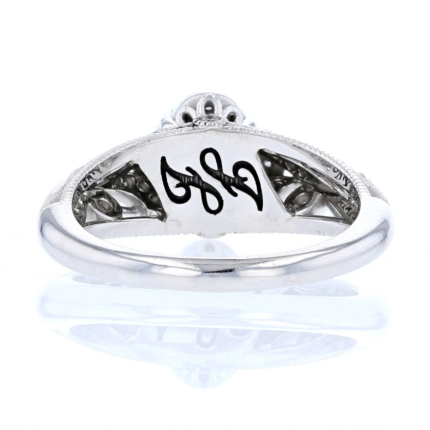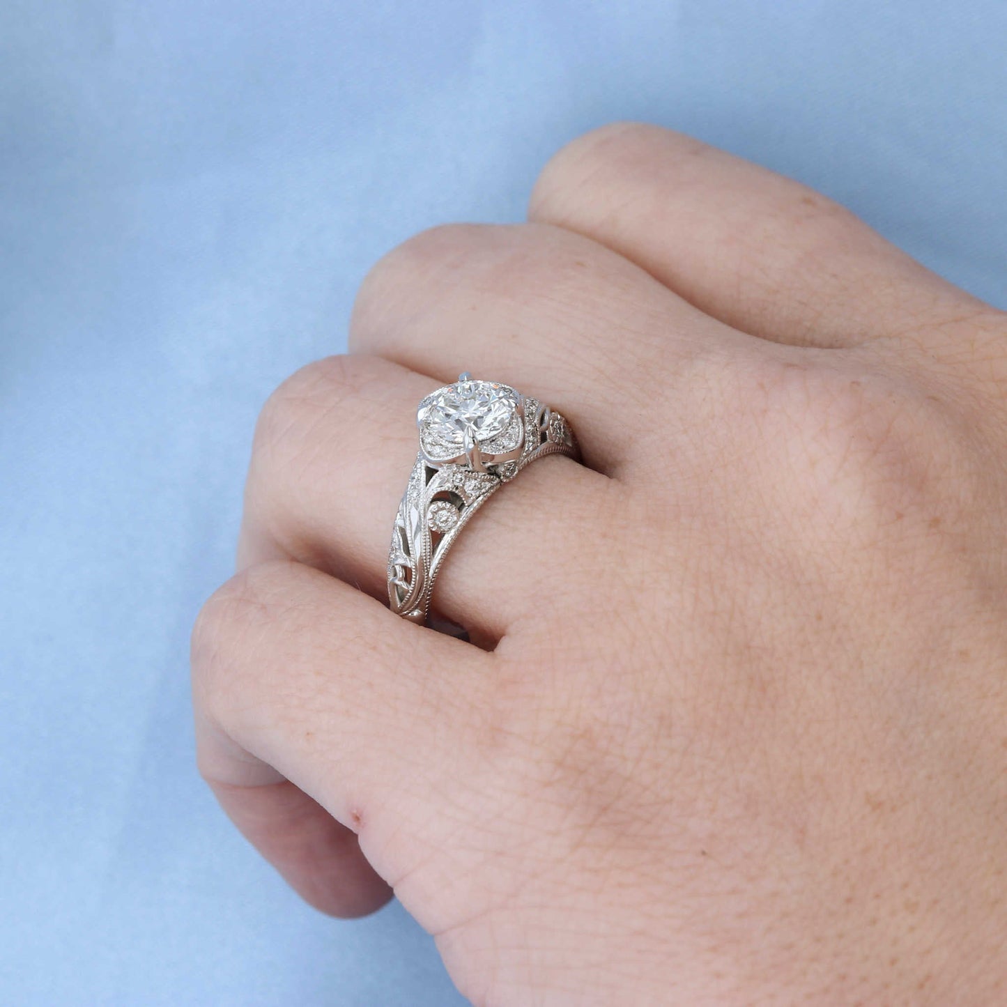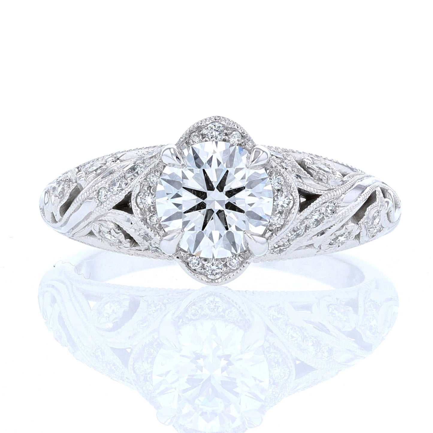 C135591This detailed engagement ring features a one carat center diamond wrapped in a scallop halo. The band is created from filigree and milgrain floral details, pave set with accent diamonds.