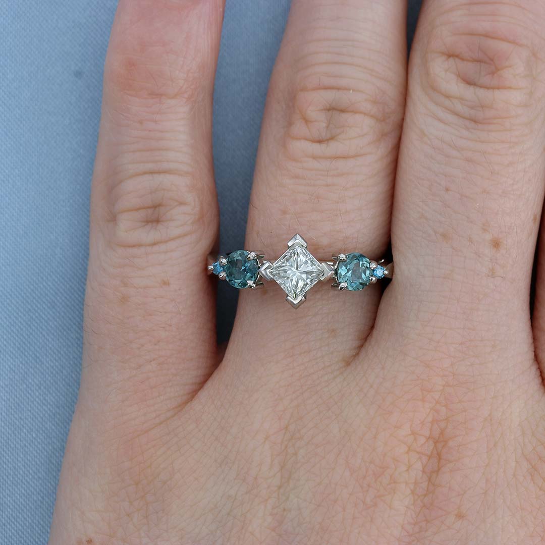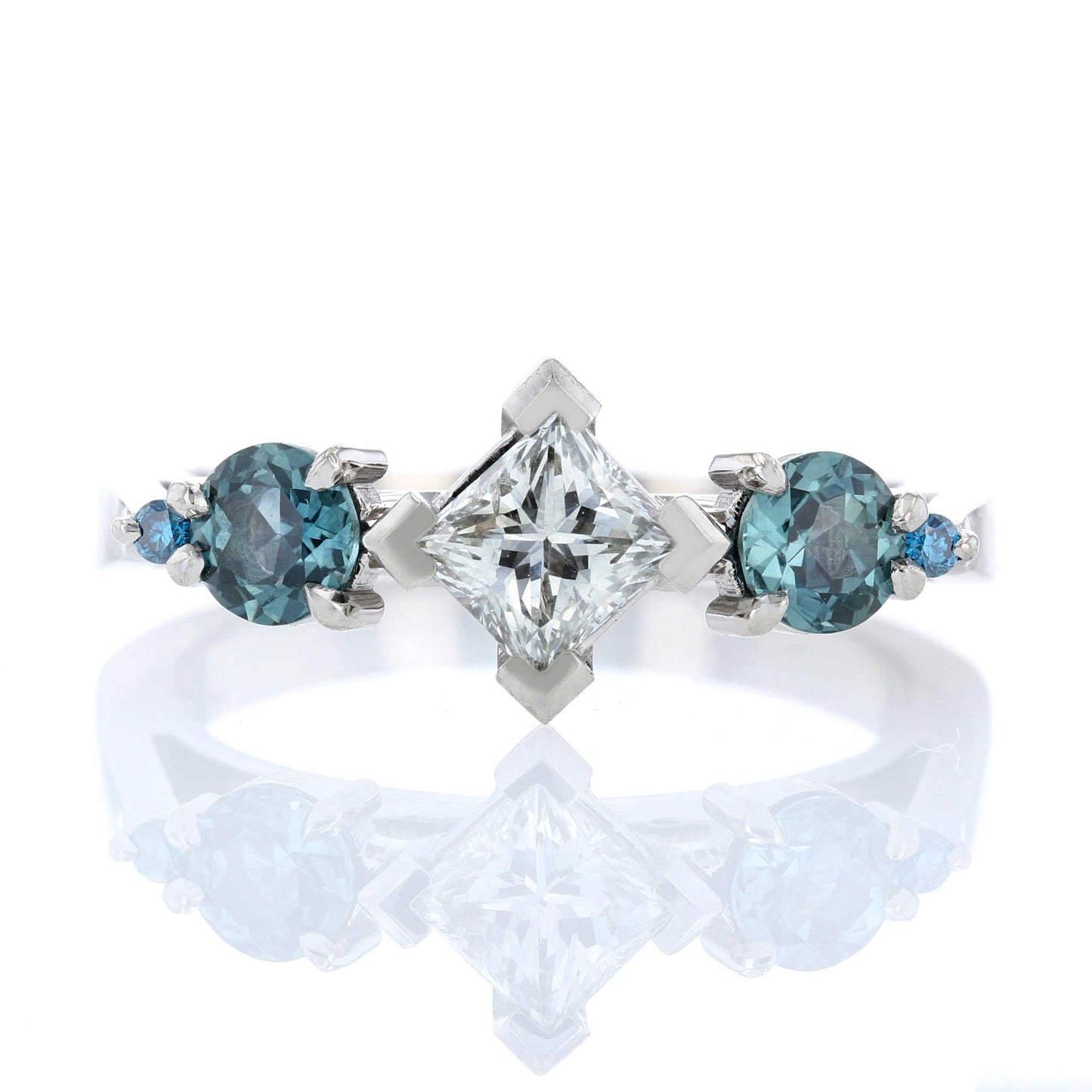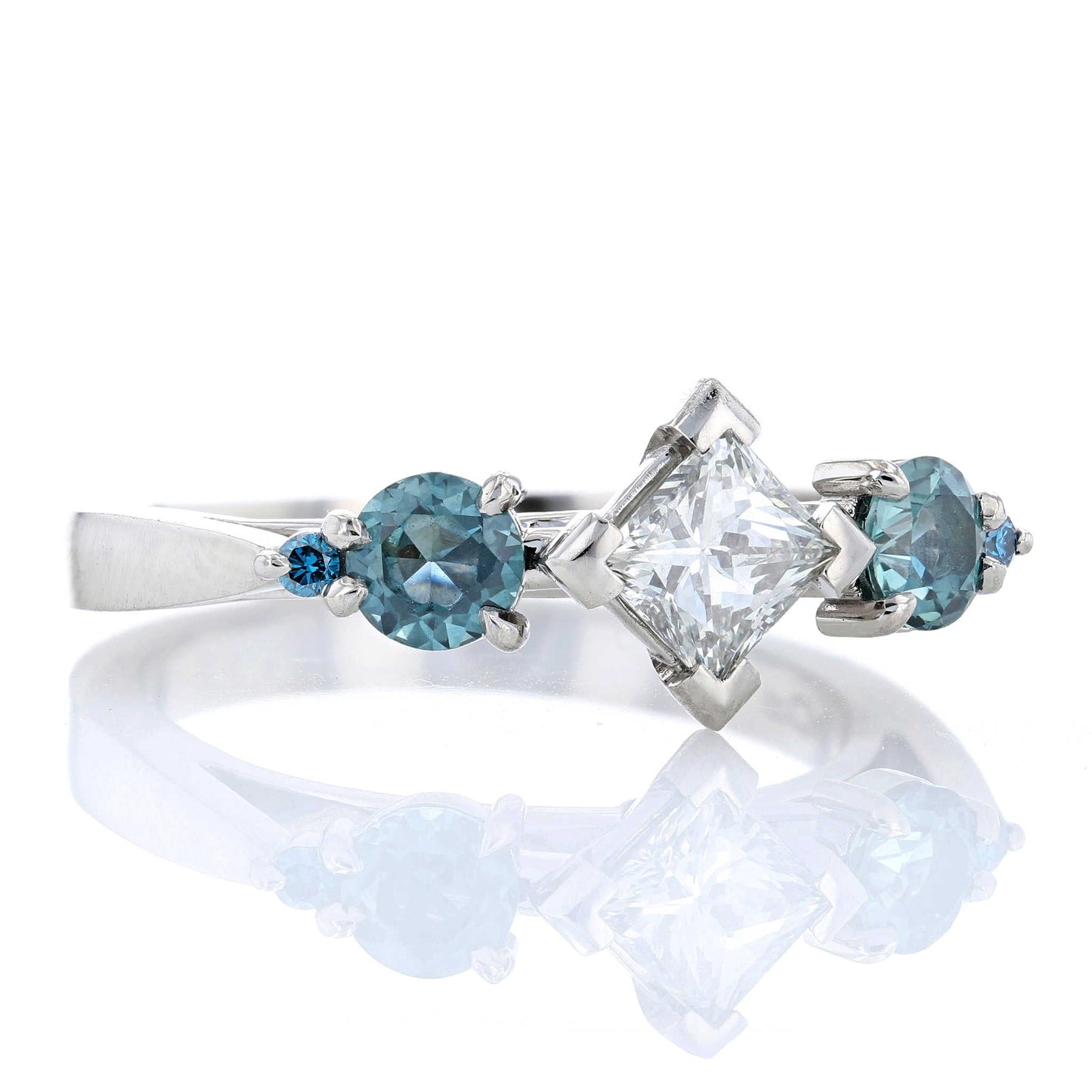 C110014Brilliant blue diamonds hug round sapphires, graduating up to a kite shape princess cut diamond, creating a geometric design in platinum.
