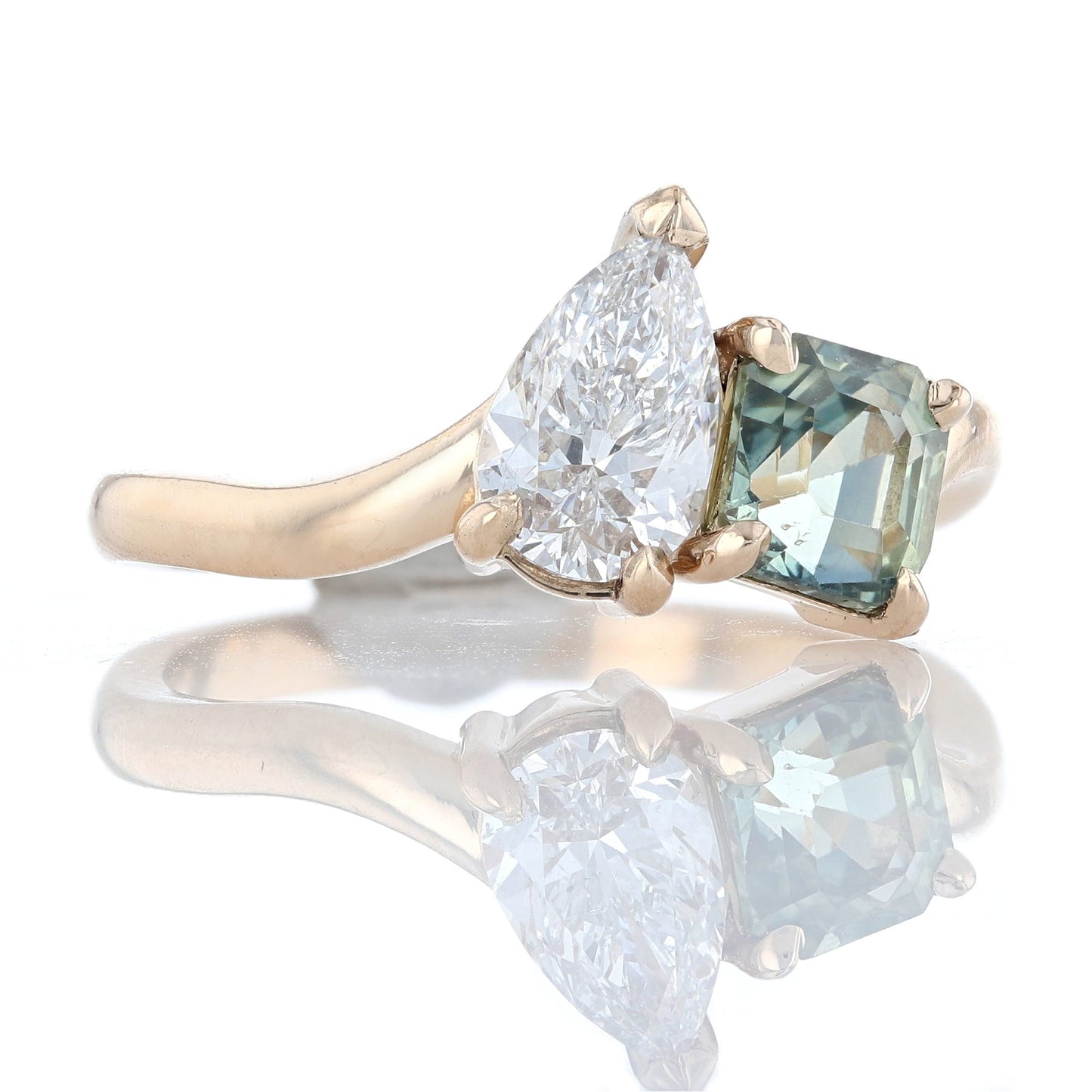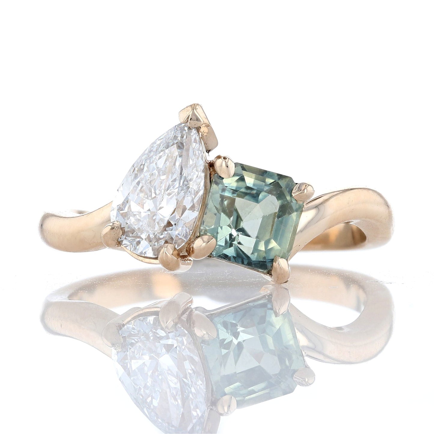 C126315This yellow gold engagement ring has a gorgeous and meaningful Toi Et Moi design, with two center stones- a pear diamond and an Asscher green sapphire, completed with a curved band.