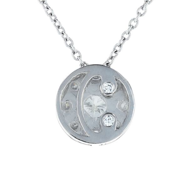 C101845We set a client's heirloom diamonds into a new platinum sliding halo pendant for his daughter. On the back, a diamond-studded "C" initial makes it personal.