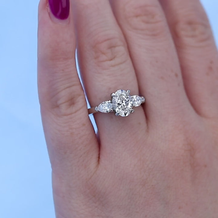 C109621This three stone ring gleams with meaning. The oval center diamond is hugged by pear shaped diamonds, all in shining platinum.
