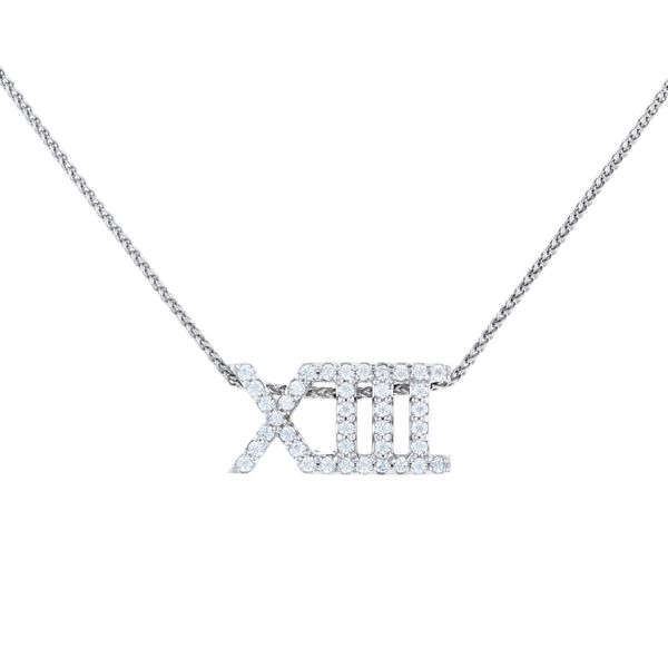C97303This Roman numeral pendant, XIII, or 13, is hand set with Hearts & Arrows ideal round brilliant cut diamonds for unparalleled sparkle.