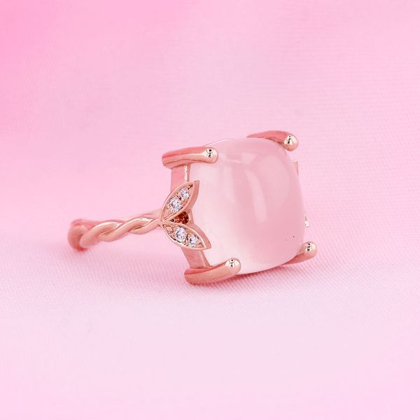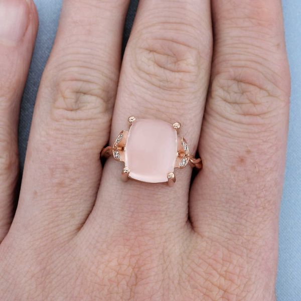 C106315We set this luminescent rose quartz cushion cabochon into a custom organic, nature-inspired rose gold ring, with a vine shank and diamond accented leaves.