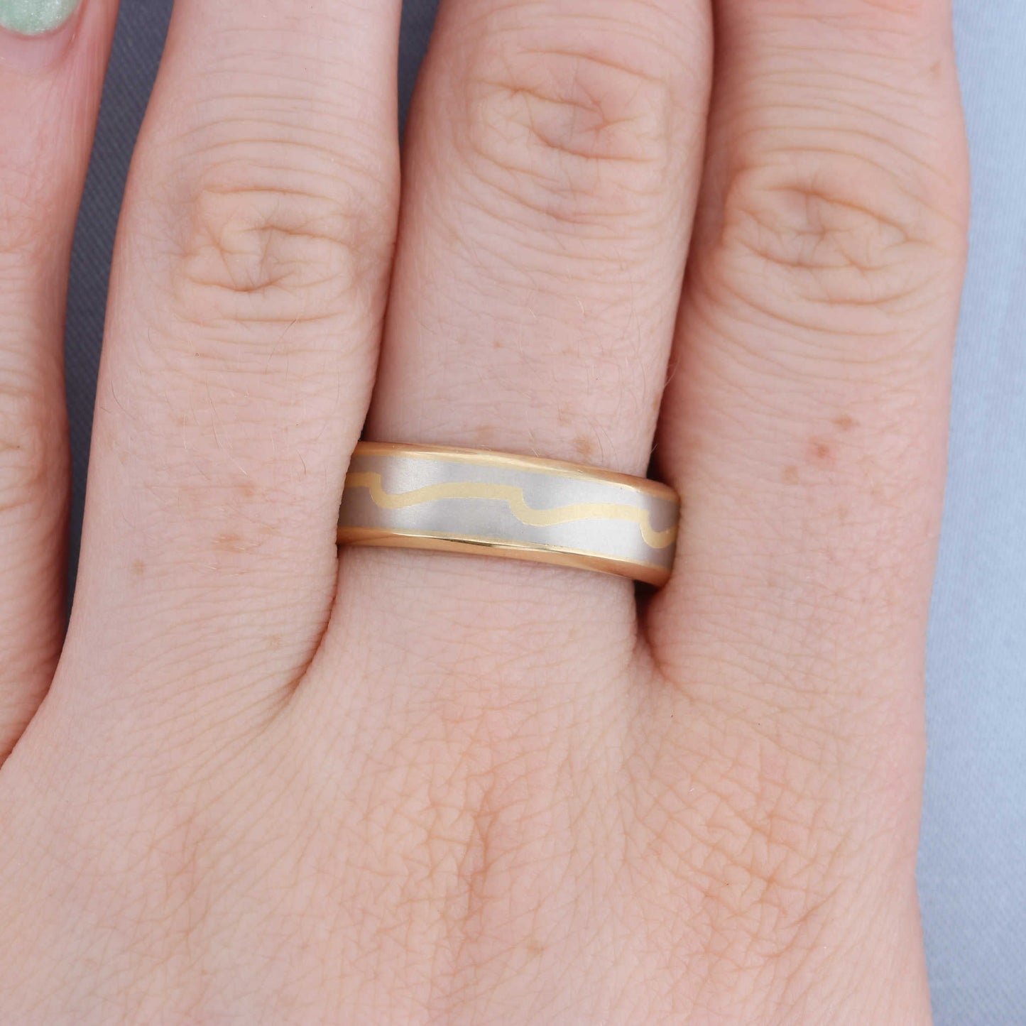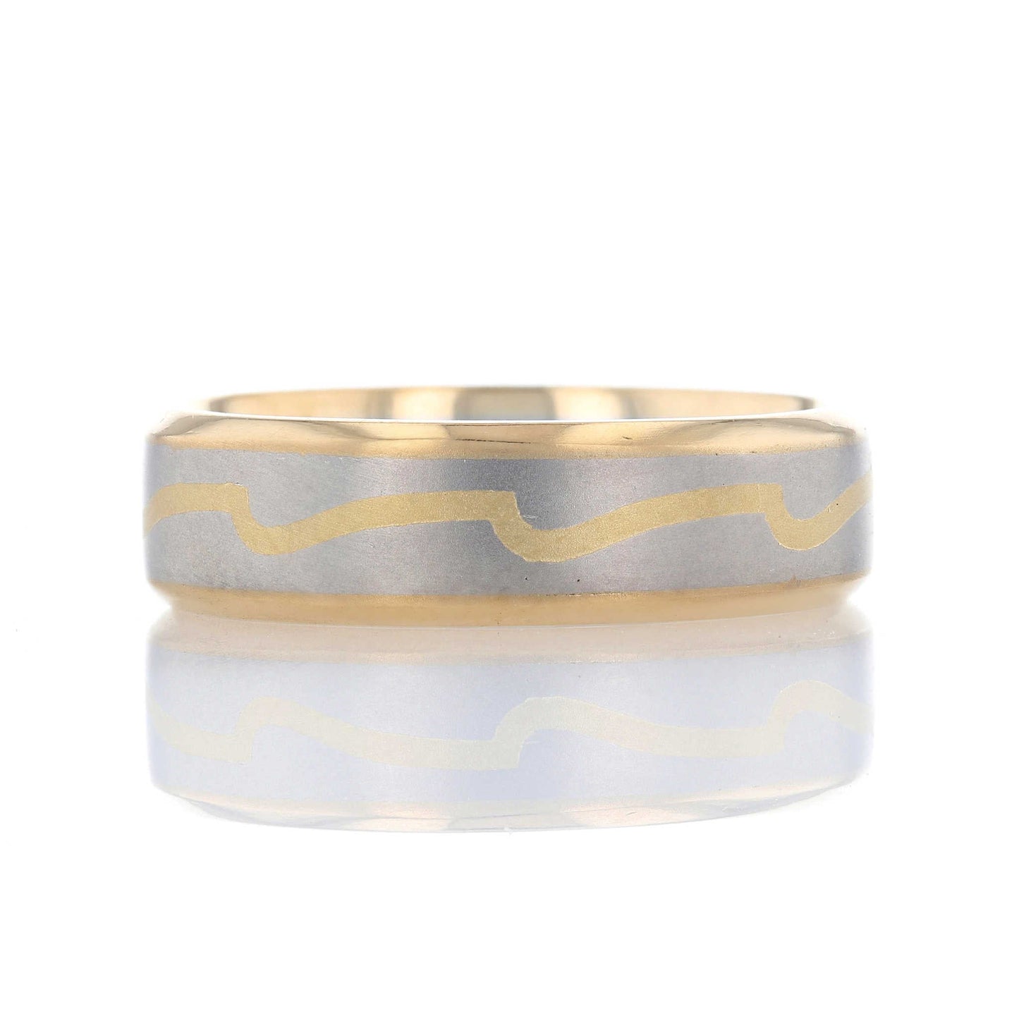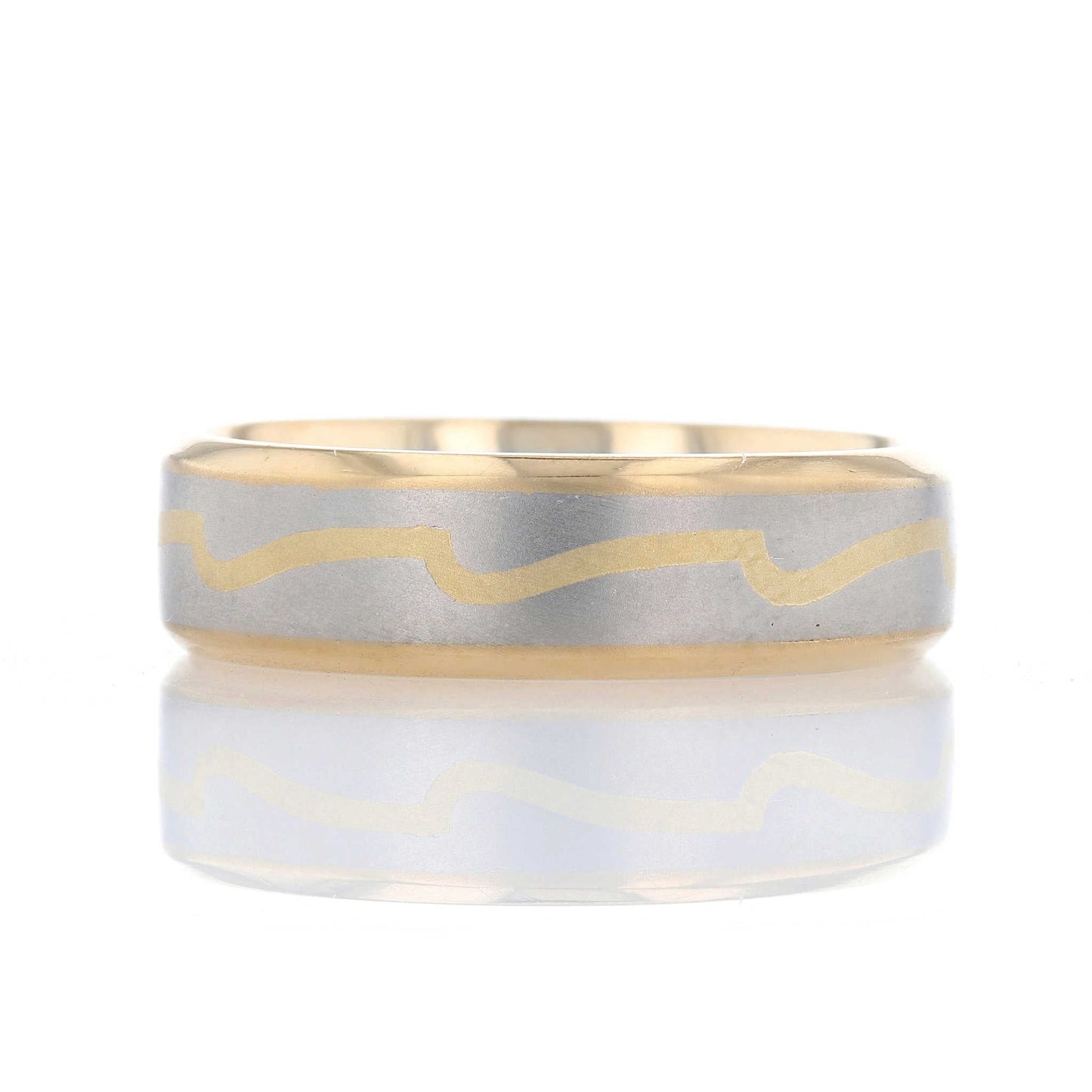 C109136This sandblast finish men's band creates a wave design using inlay two tone white and yellow gold.