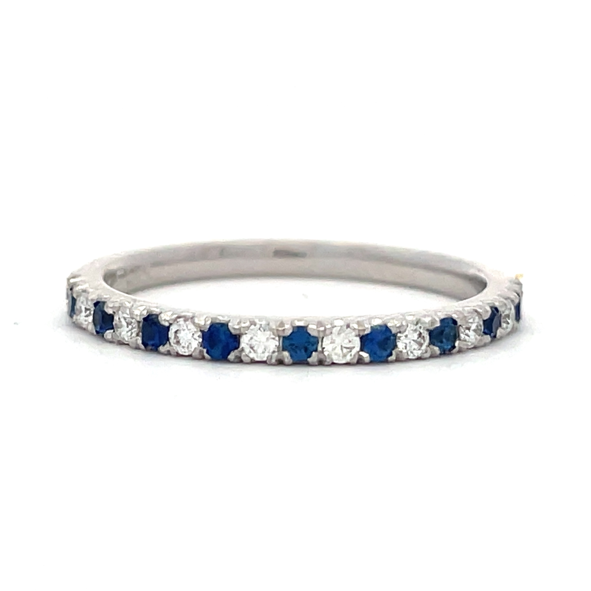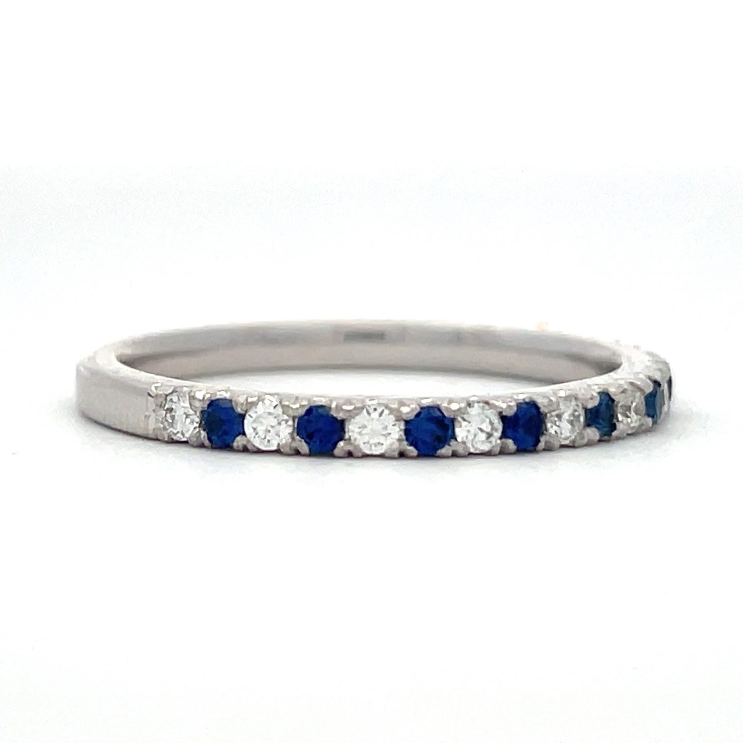 14k White Gold 0.15 carat total weight Sapphire & 0.14 carat total weight GH Color, SI Clarity Hearts & Arrows, Diamond Band, Size 6.375. Made by Fox Fine Jewelry.