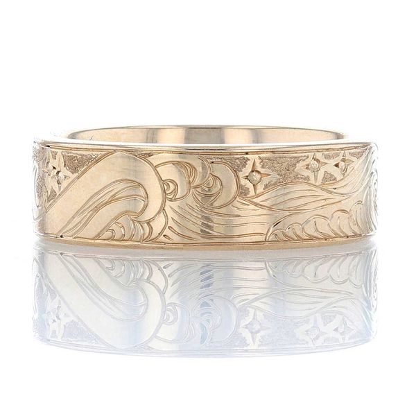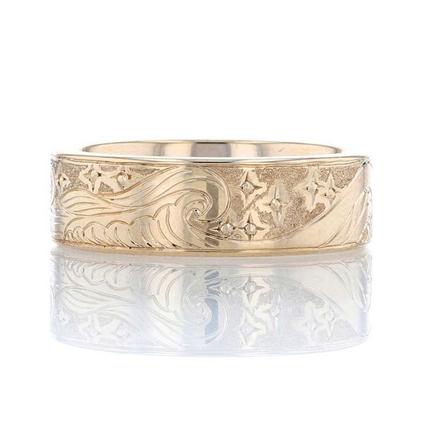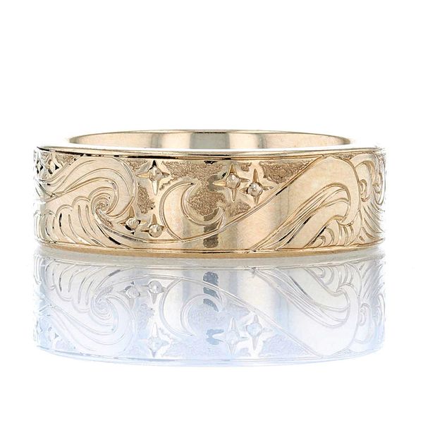 C104598-BWe hand engraved a pattern on this yellow gold band based on our client's drawing: an ocean nightscape with rolling waves and twinkling stars.