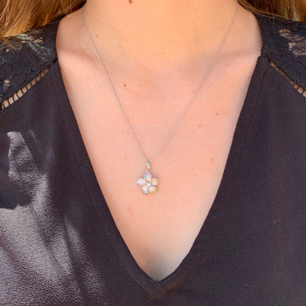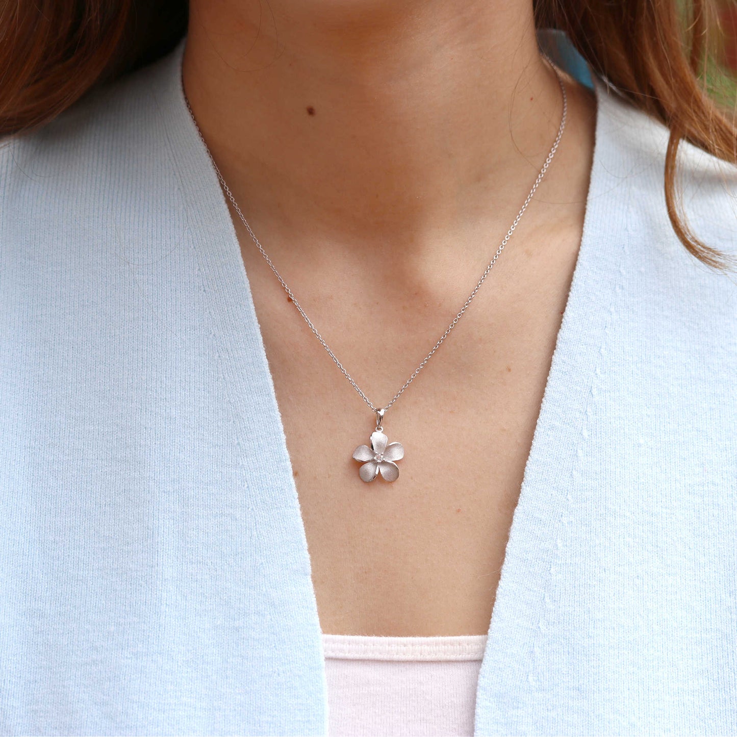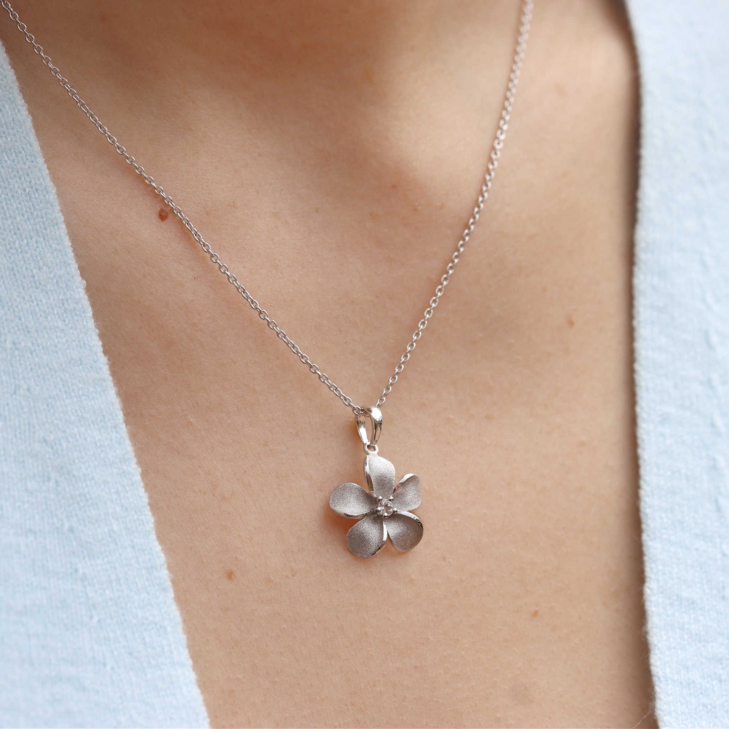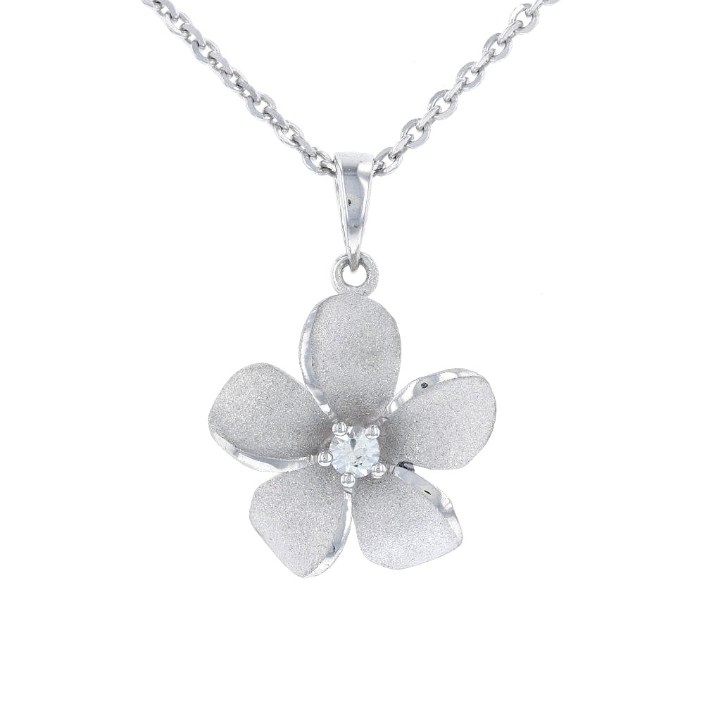 Precious Silver 0.08 carat White Sapphire 15 mm Plumeria Pendant with 18" Sterling Silver Chain by Denny Wong. Other chain lengths available upon request.