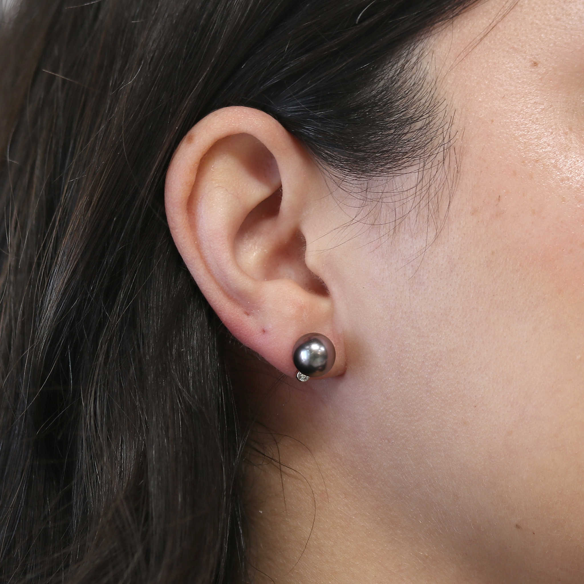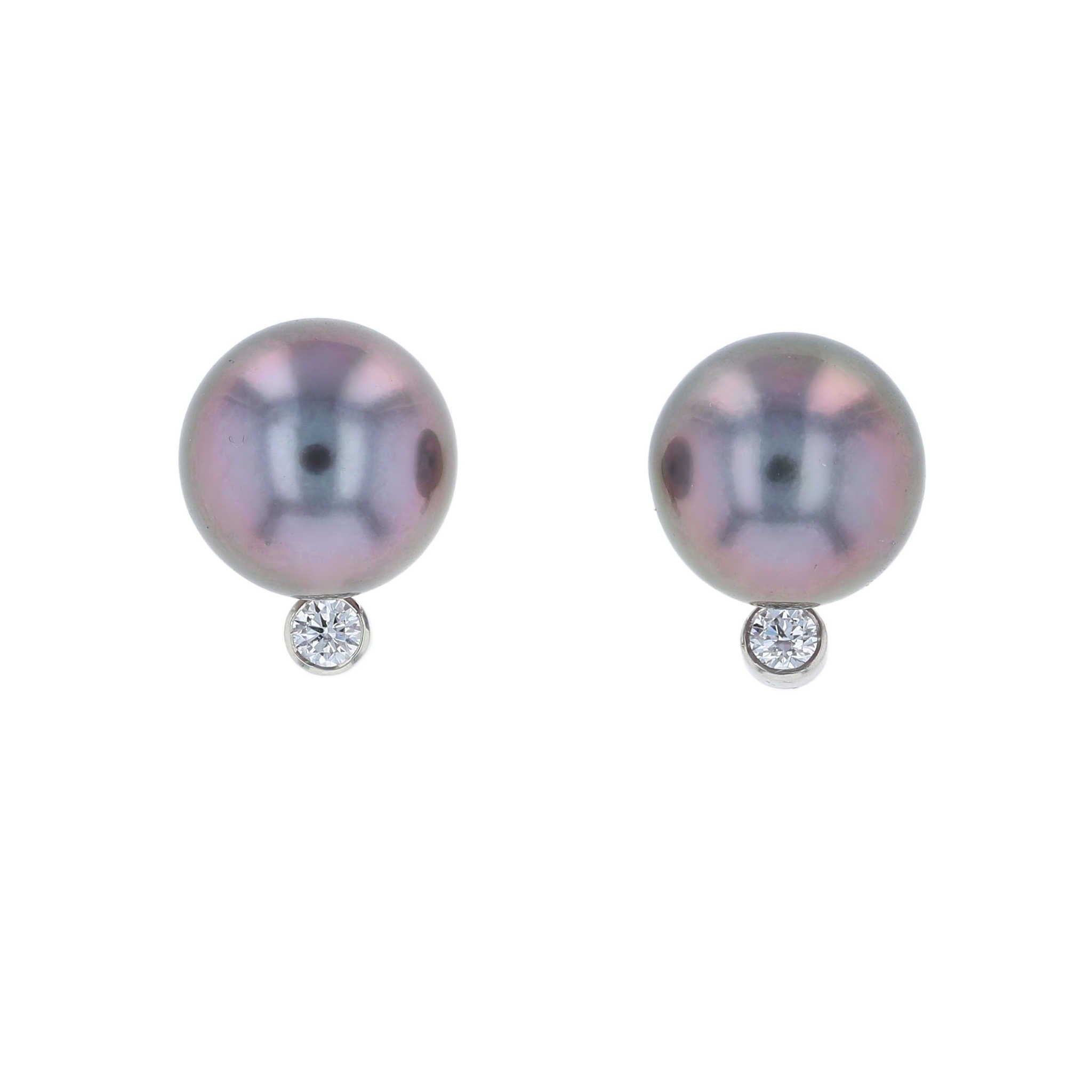 C141870These gorgeous studs feature 9mm Tahitian pearls accented by bezel set diamonds nestled beneath them.
