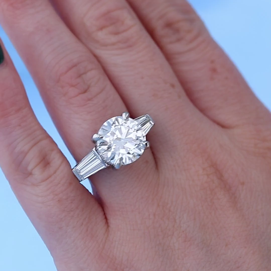 C112488There's no denying the sparkle on this ring that features a round brilliant cut diamond that's over 5 carats. It's hugged by channel set tapered baguette diamonds, for the chicness of a three stone ring. Delicately sitting beneath the center stone is a hidden halo of diamonds, a secret detail just for you.