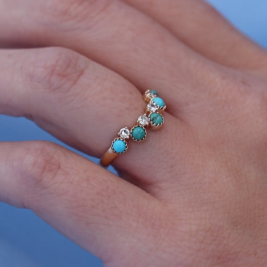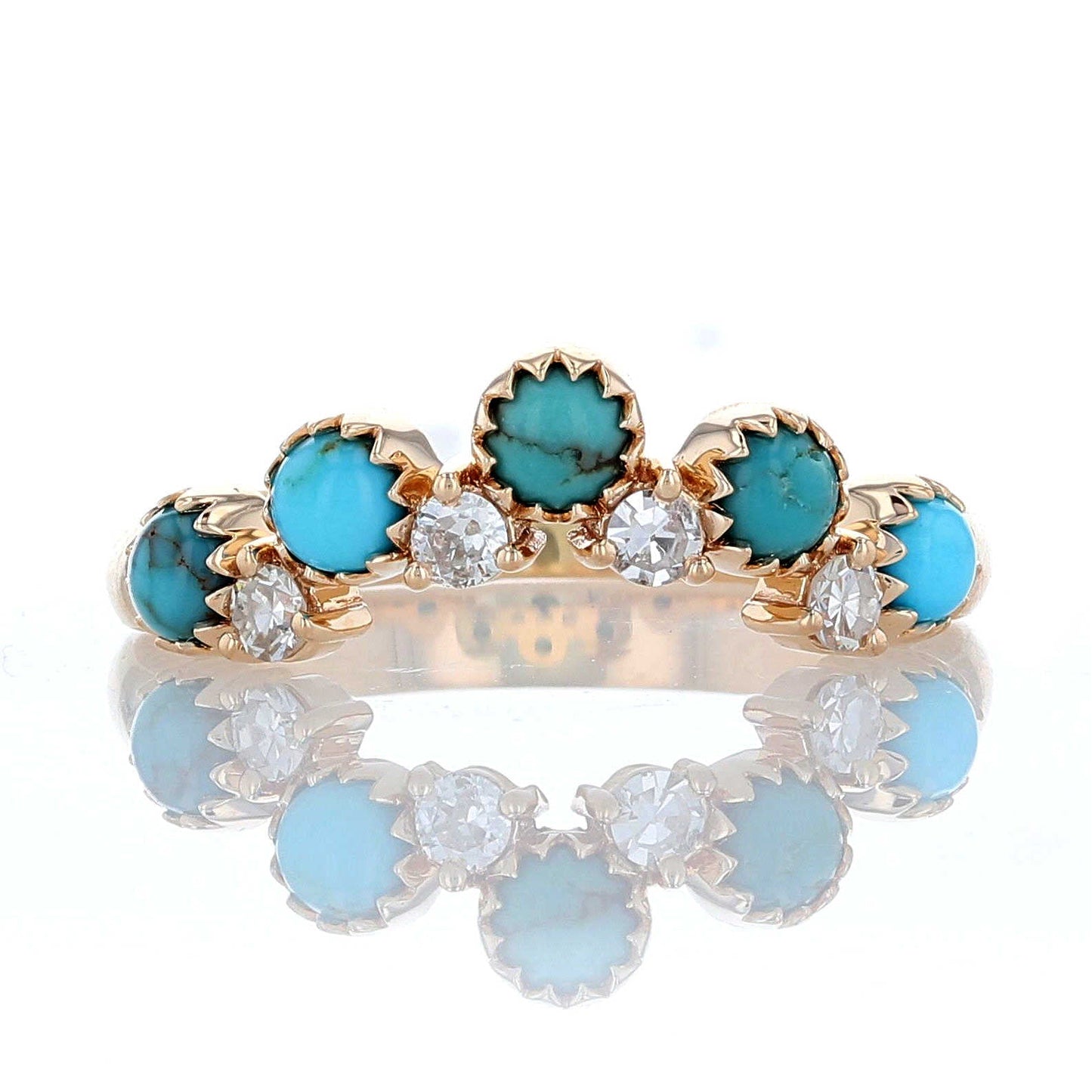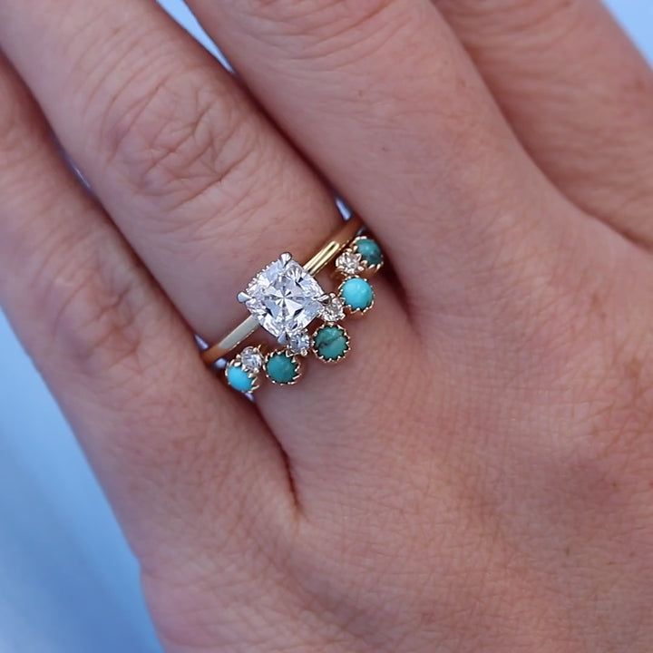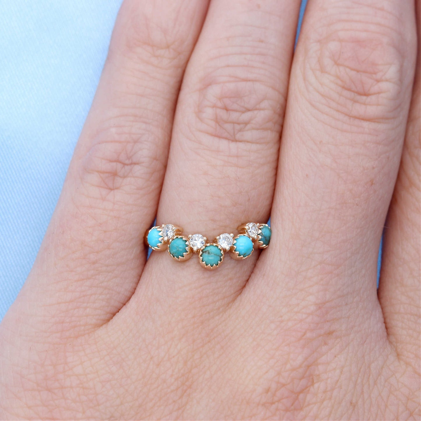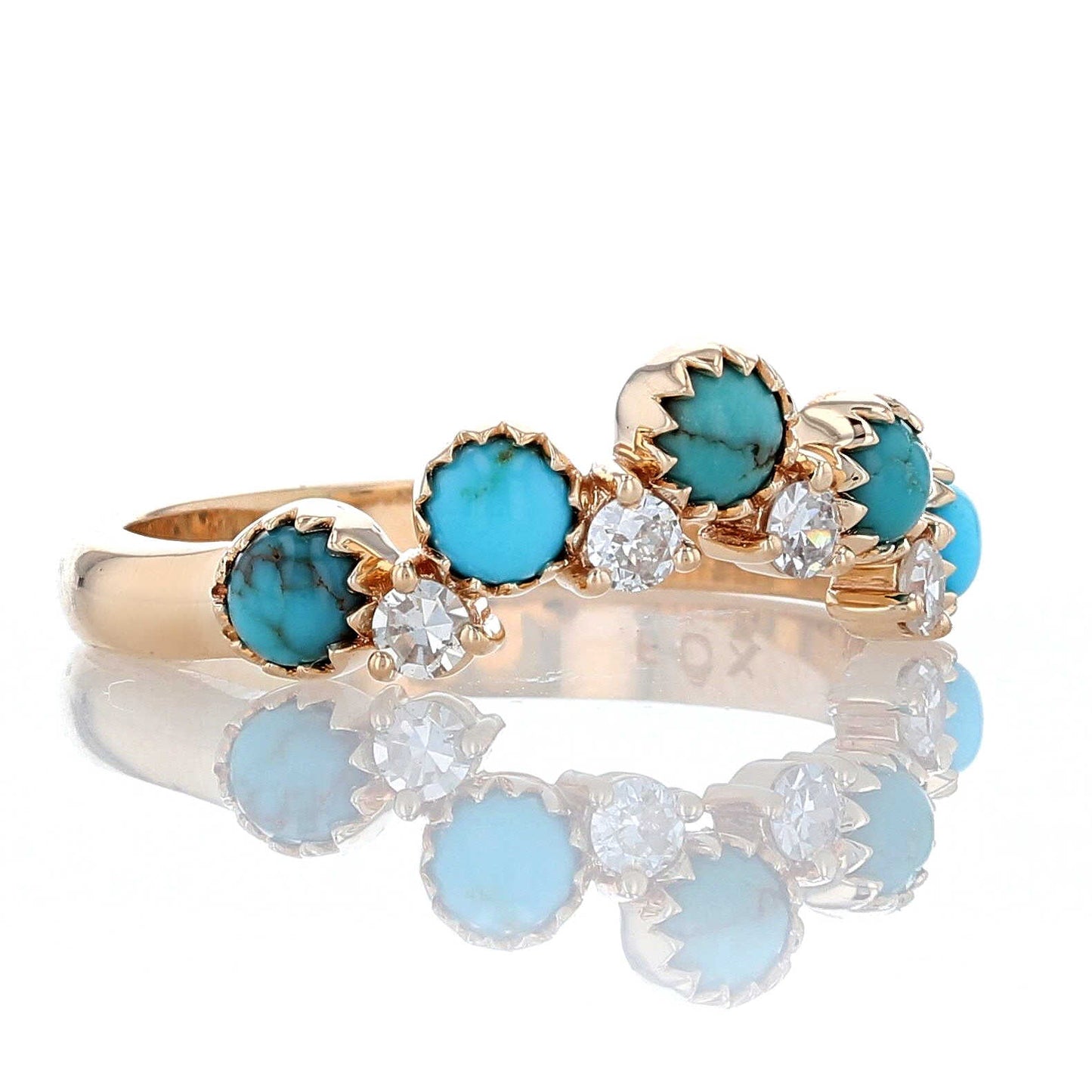 C109038Alternating turquoise and round diamonds are staggered to create a contour wedding band in yellow gold.