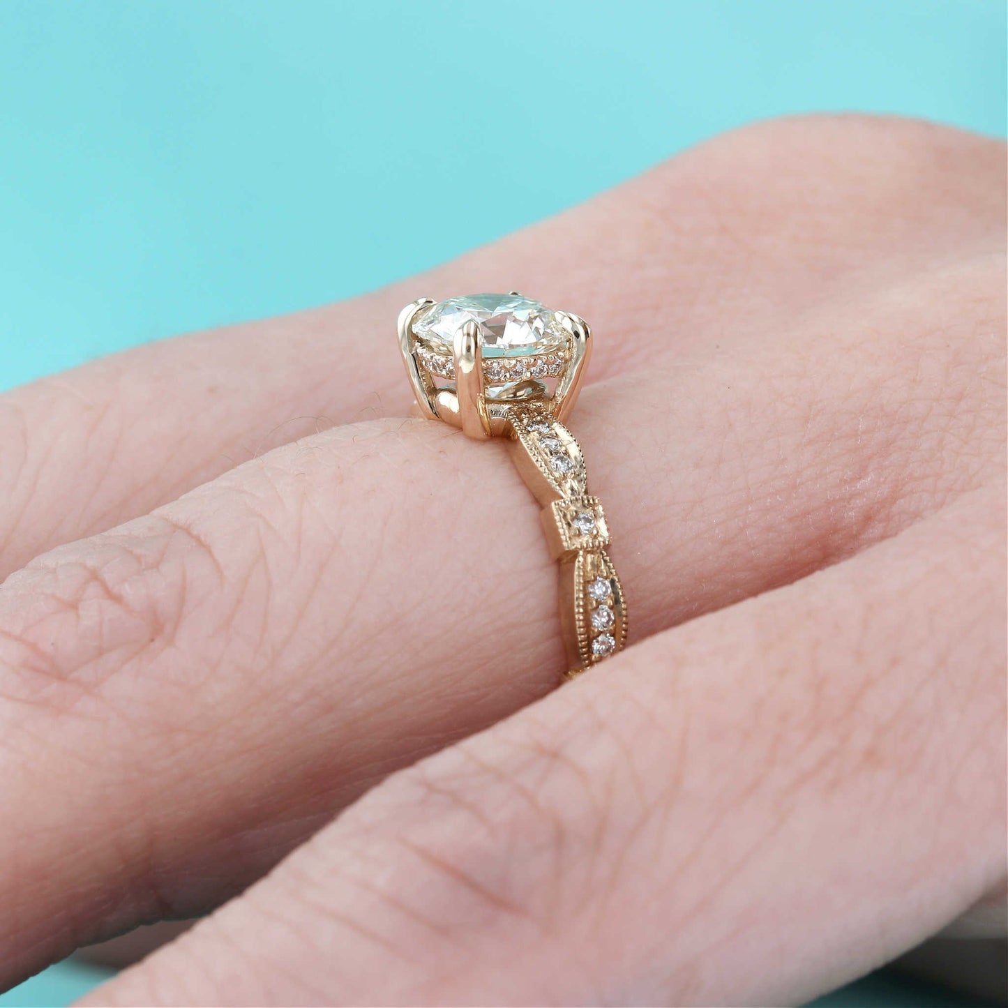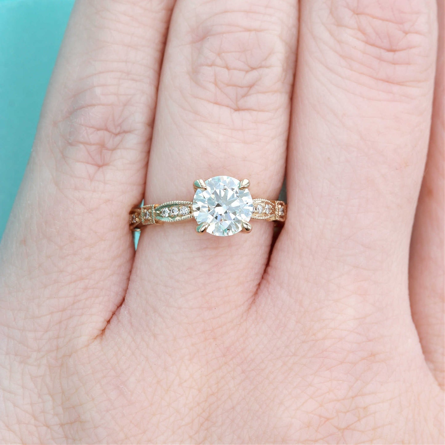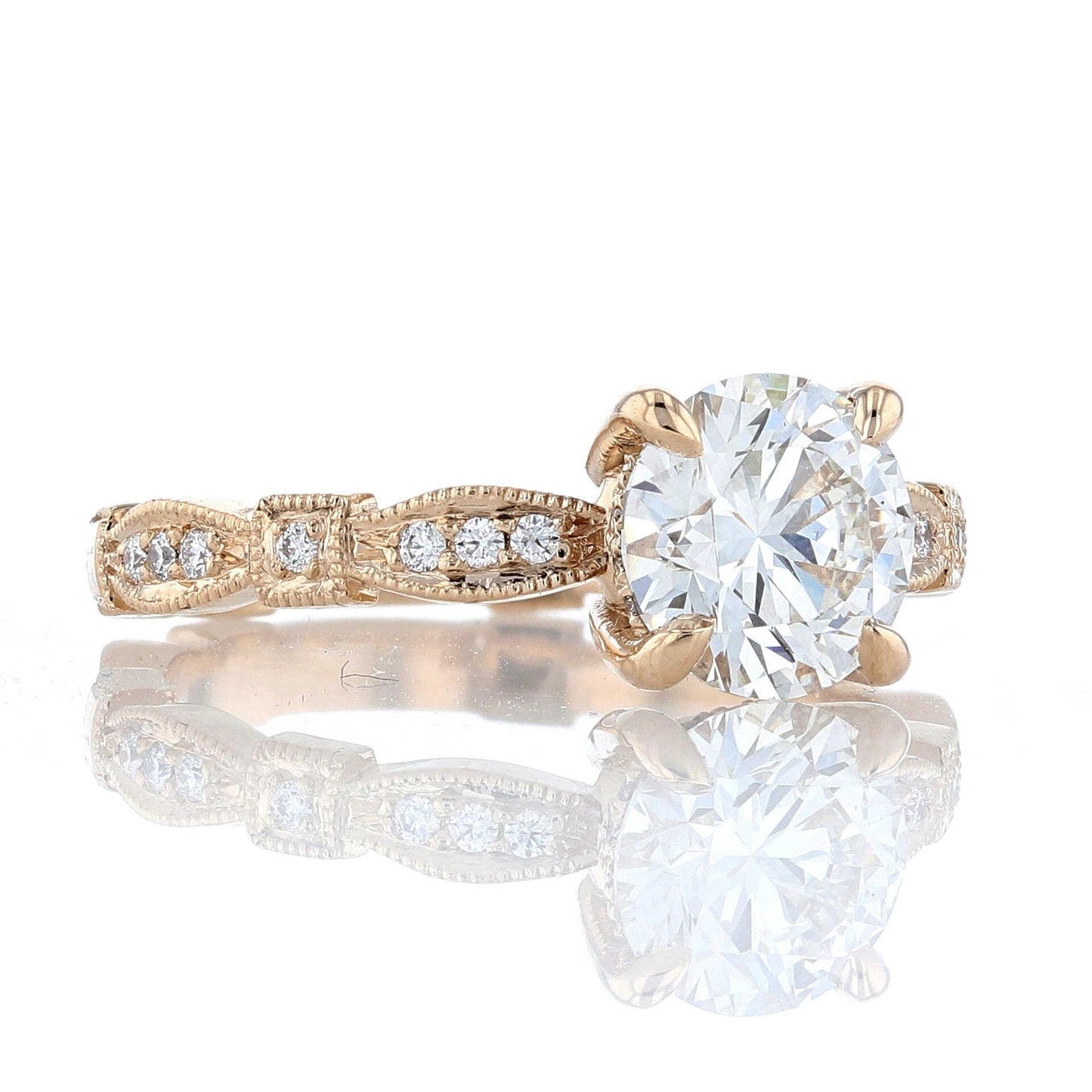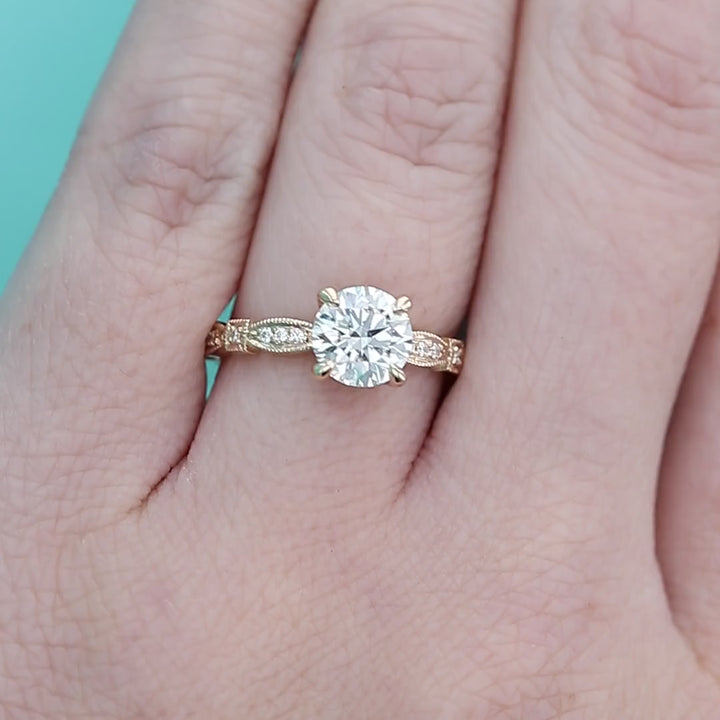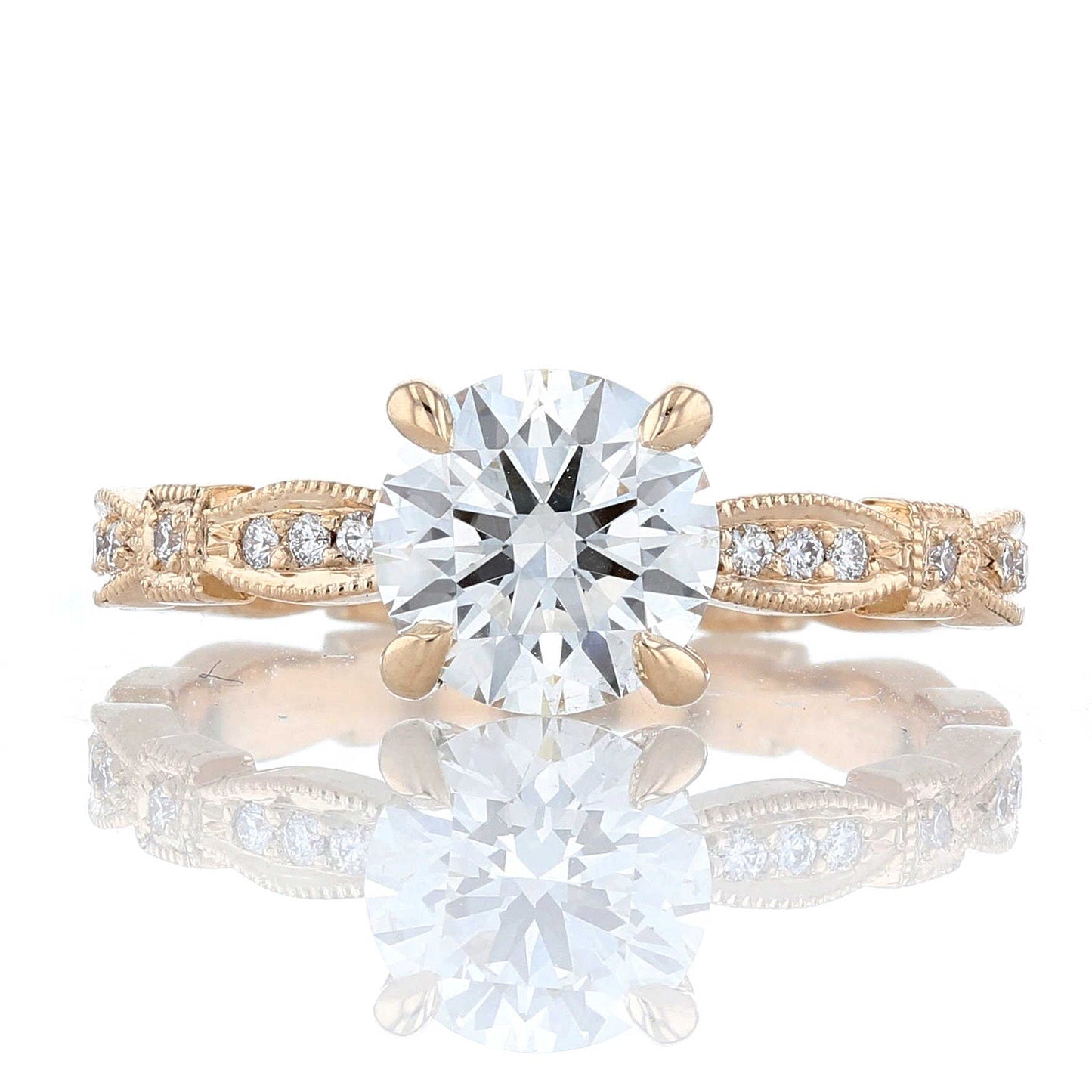 C113255Delicate milgrain hugs the diamond accents, creating a wonderful vintage inspired design. A ribbon of diamonds encircles center diamond, creating a hidden halo.