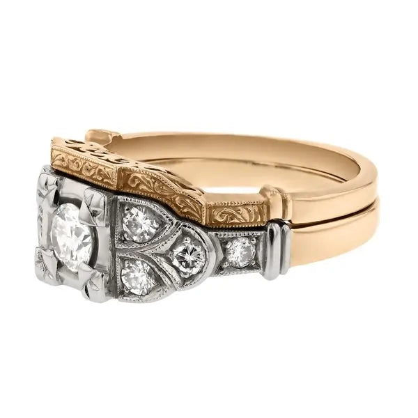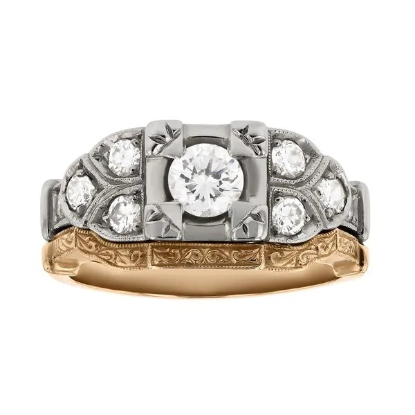 52540This wedding set is the perfect combination of sparkling diamonds and beautiful vintage-inspired details, including milgrain and hand engraving. The two-tone mixture of white and yellow gold complements the design and leads the eye around the entire ring.