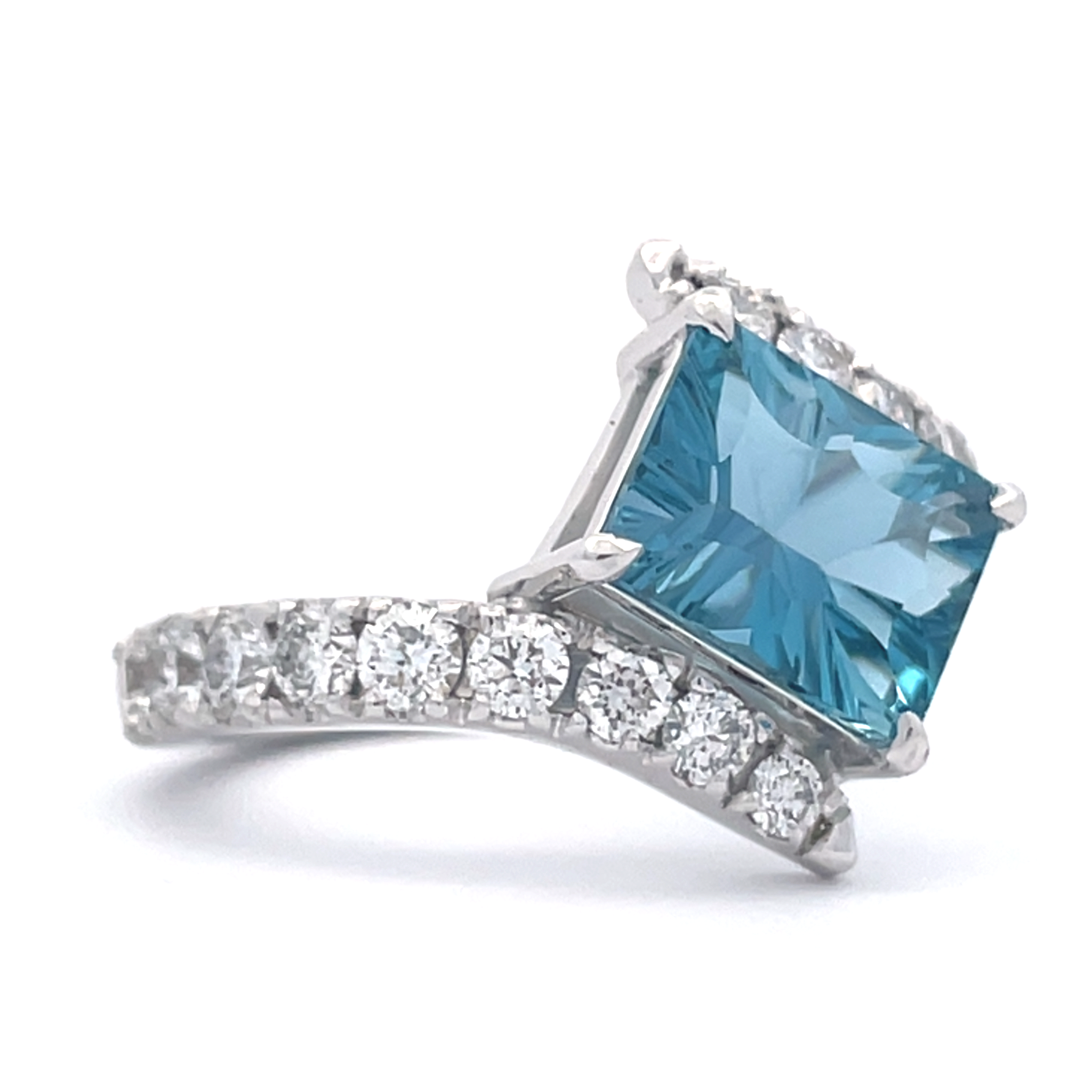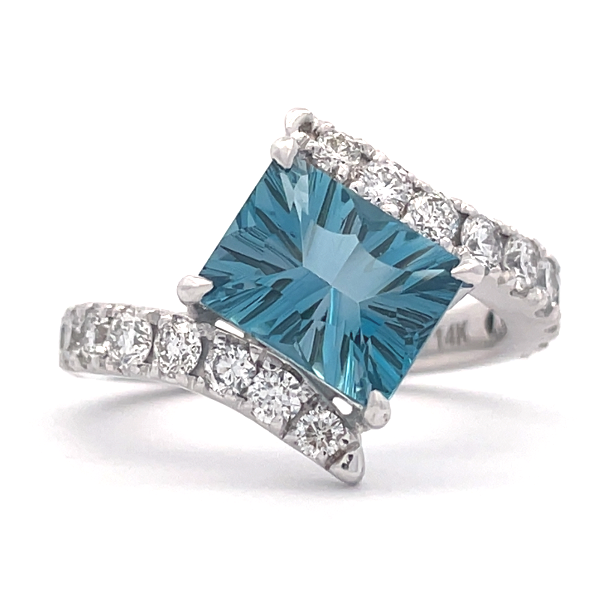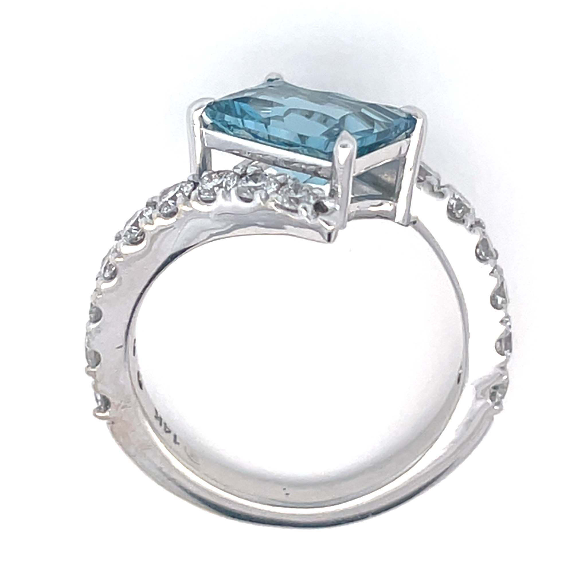 14 Karat White Gold 2.33 carat (9 x 7 mm) Blue Topaz & 1.10 carat total weight (estimated) GHI Color, SI1-SI2 Clarity Diamond Bypass Ring, Size 6.5.