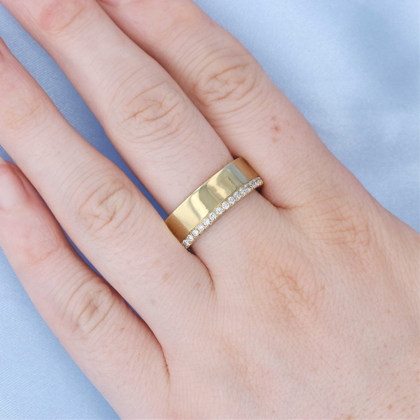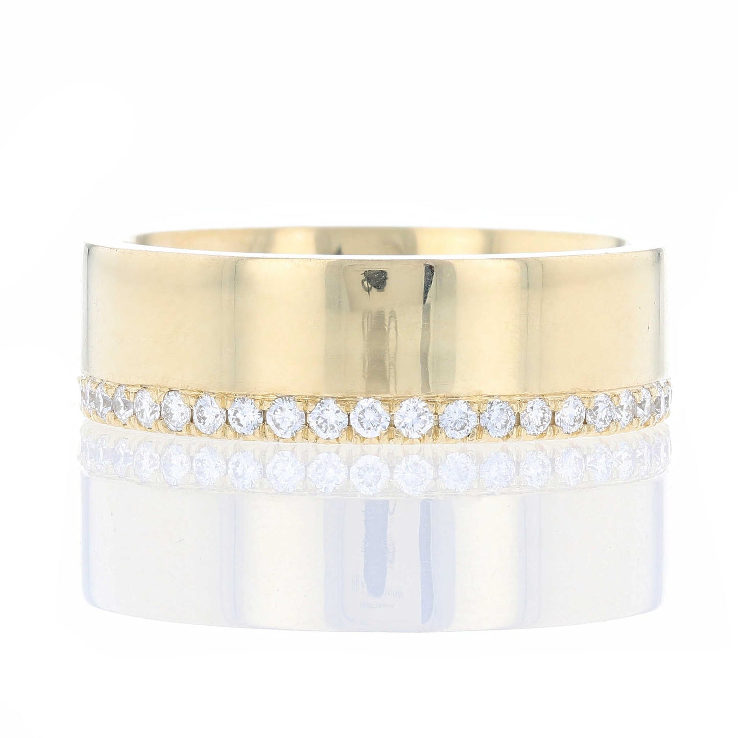 C128666This asymmetric men's band has an offset strand of diamonds, set into 18 karat yellow gold.