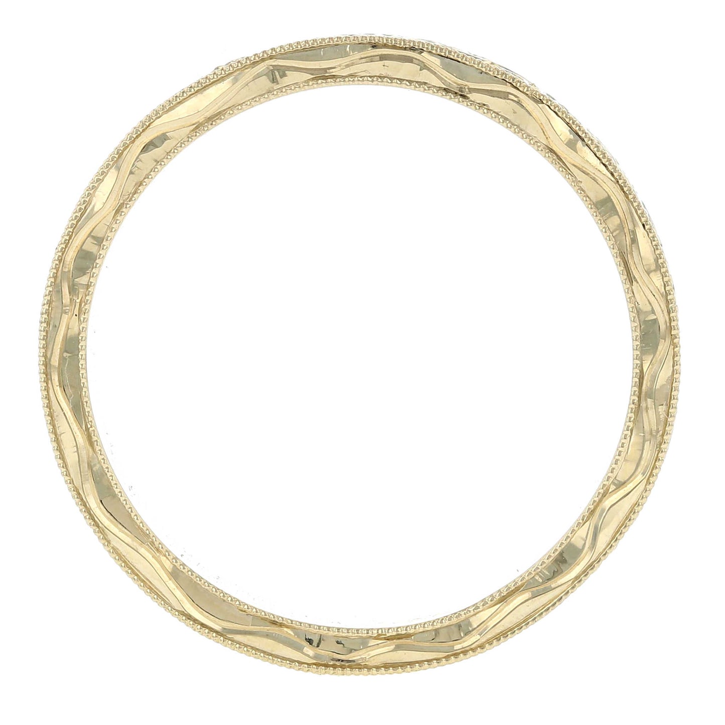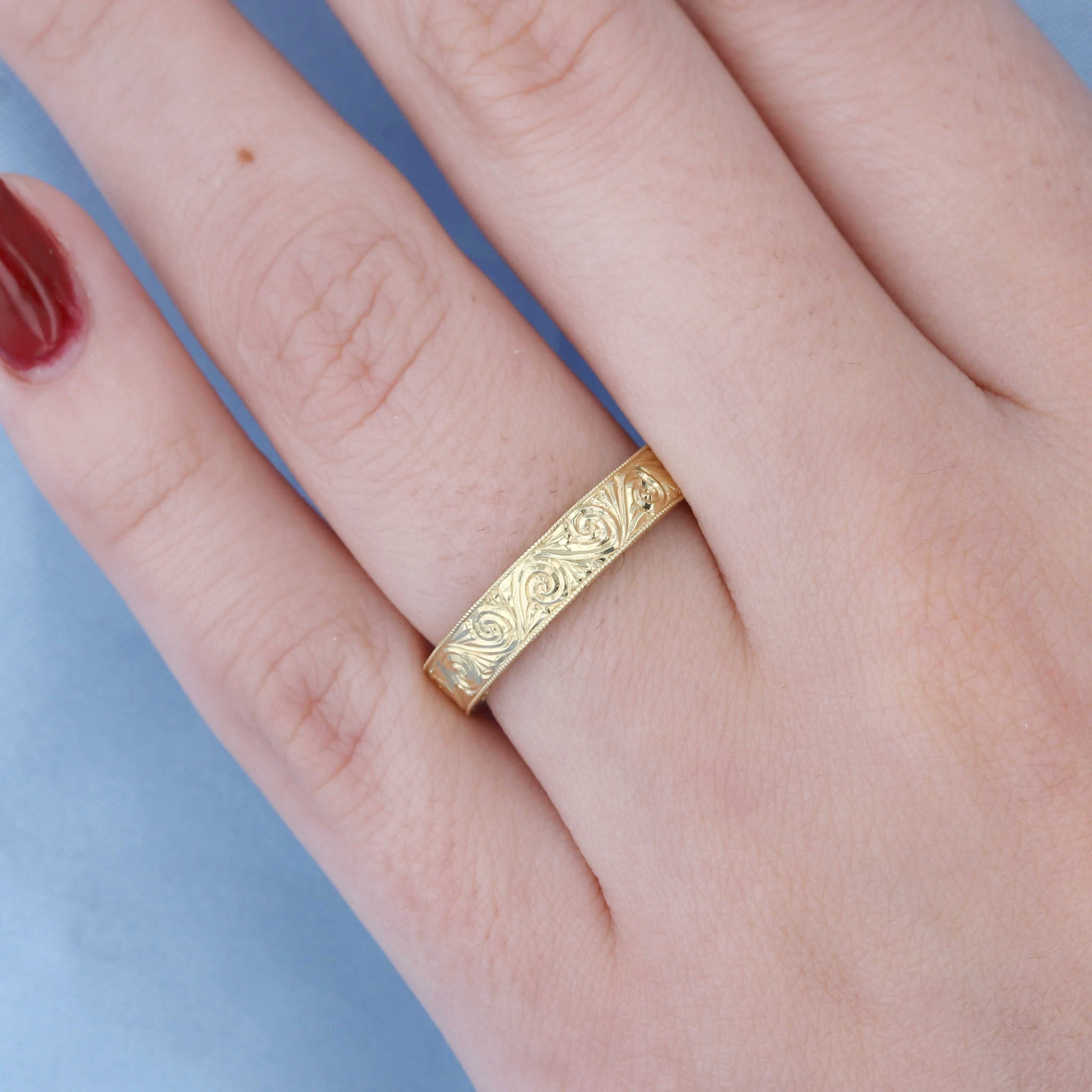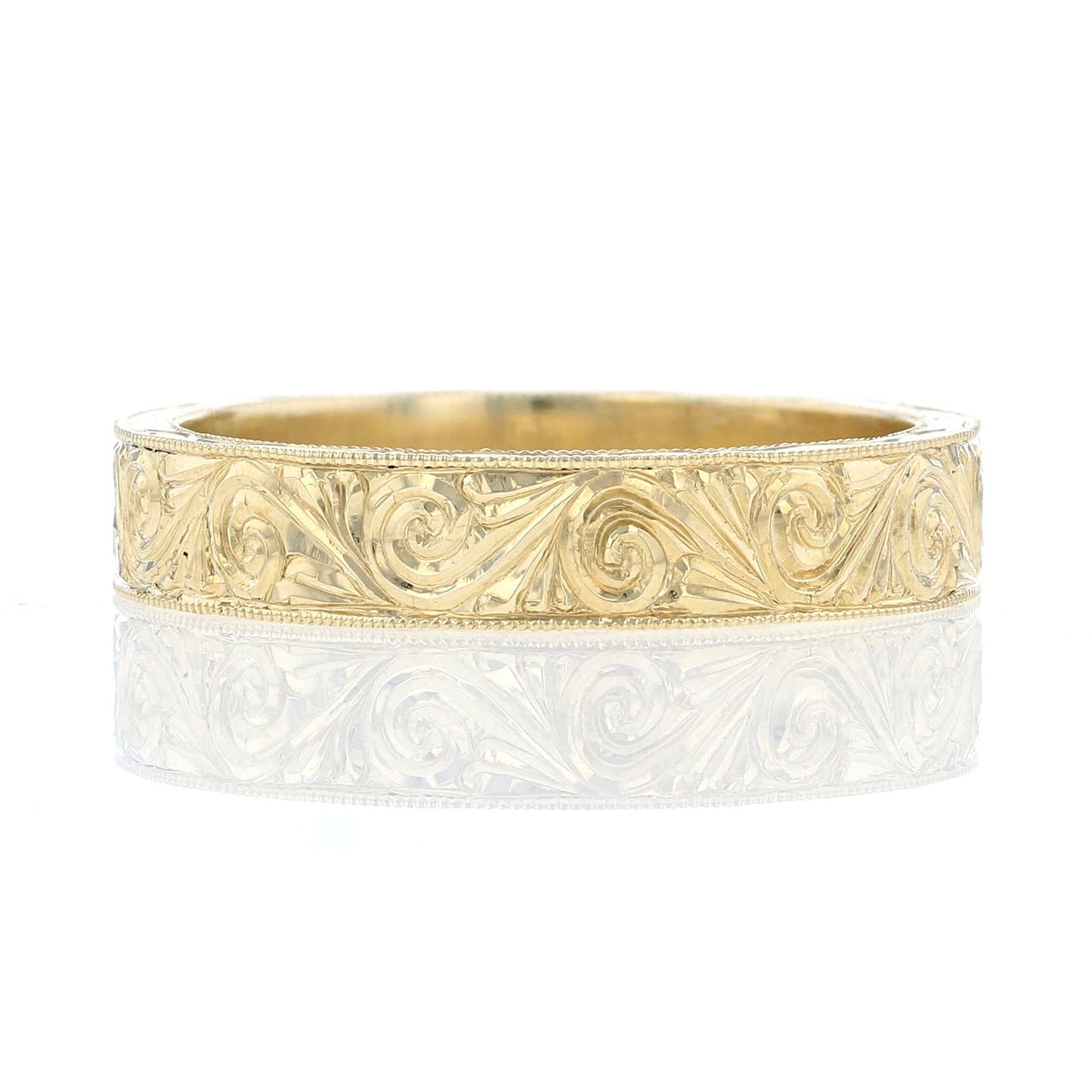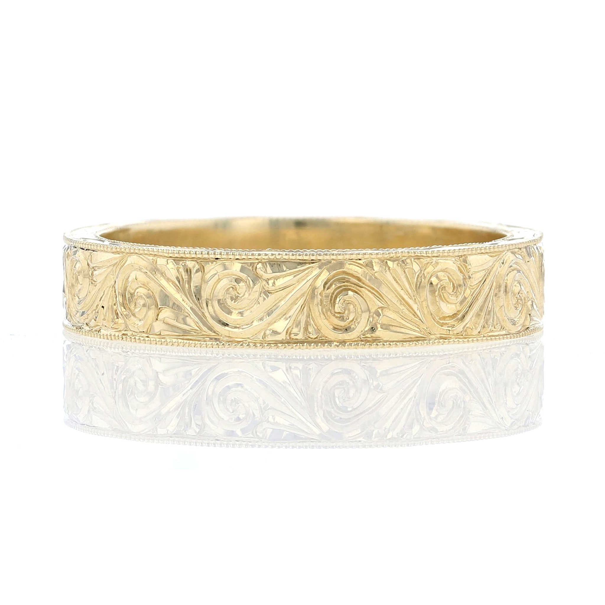 18k Yellow Gold 4 mm Scroll Luminesque Pattern Hand Engraved Band with Milgrain, Size 7. Hand Fabricated and Engraved by George Fox.