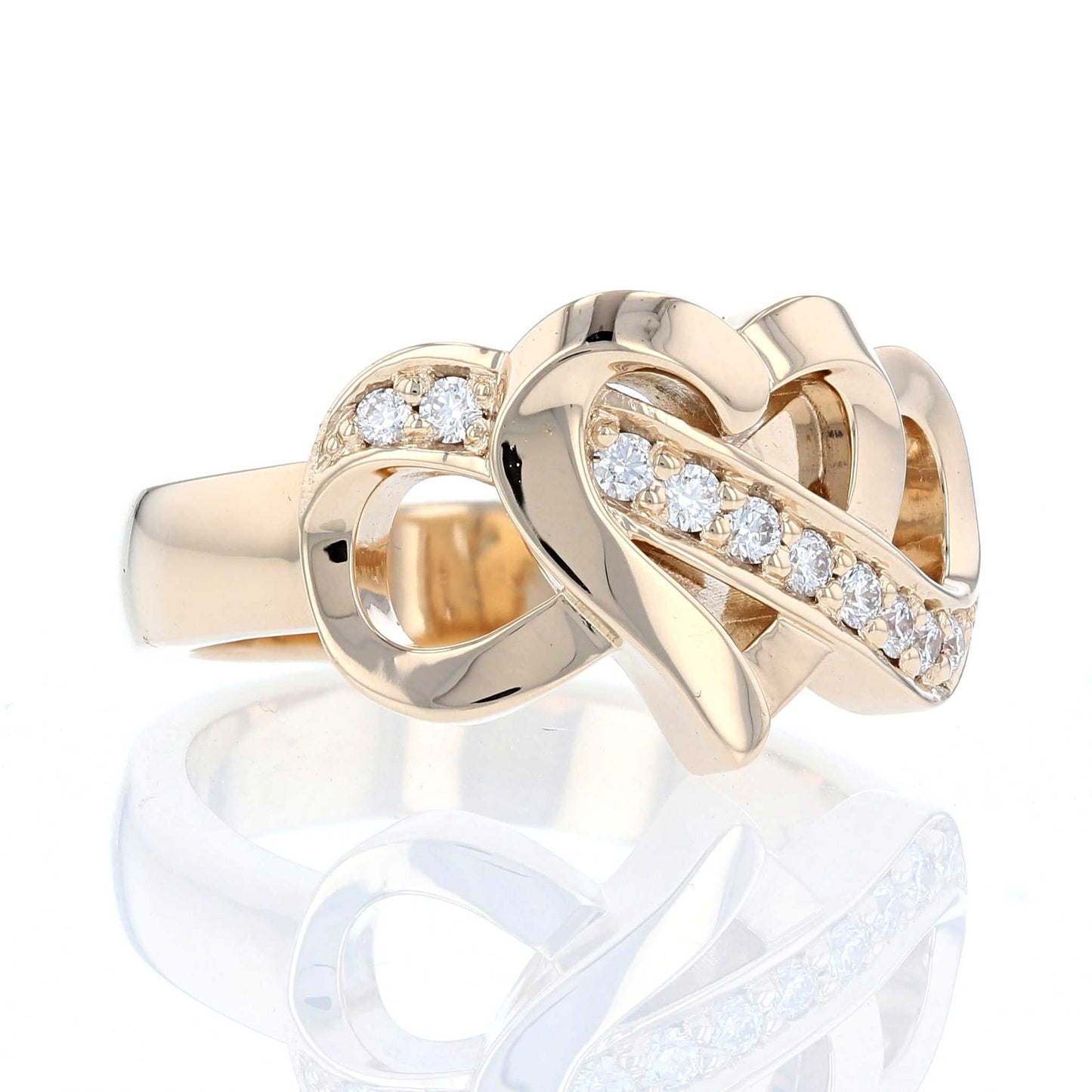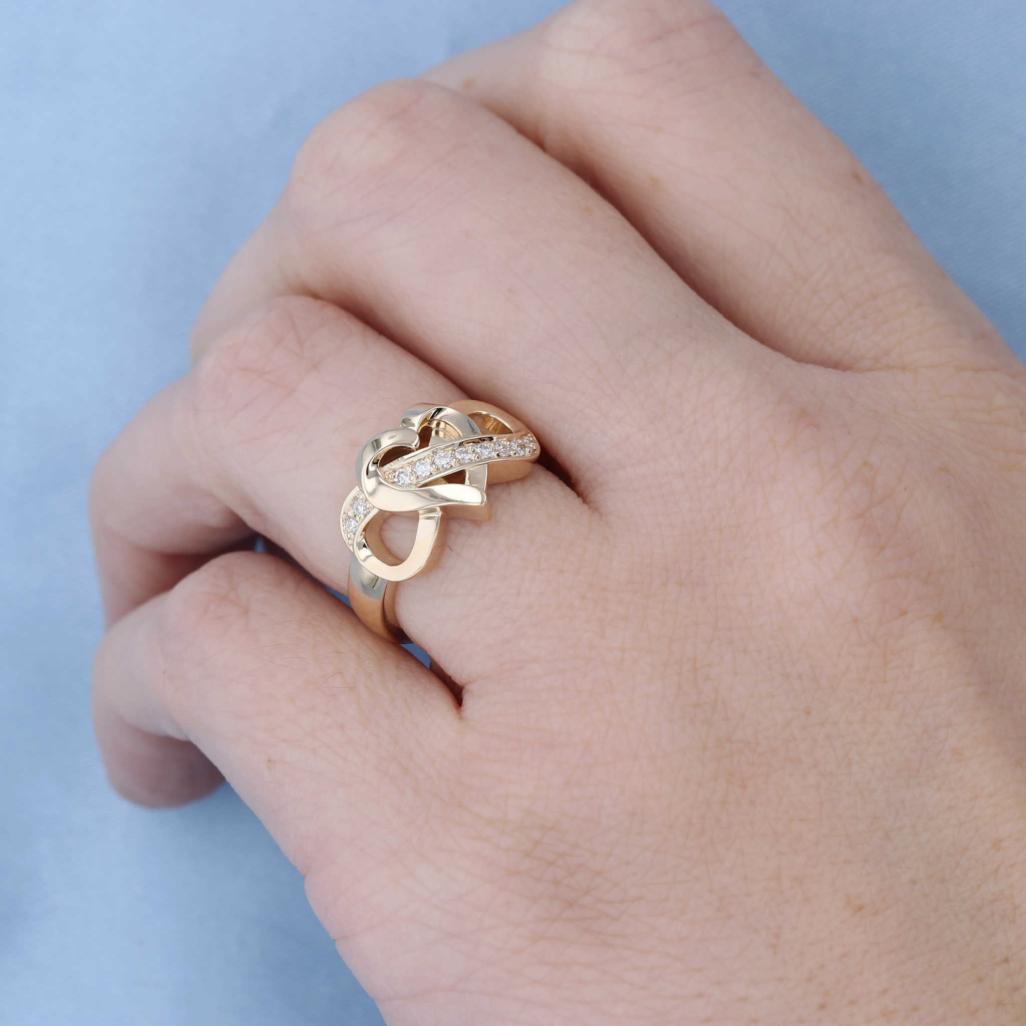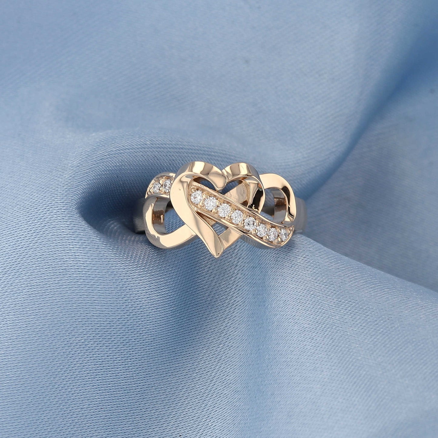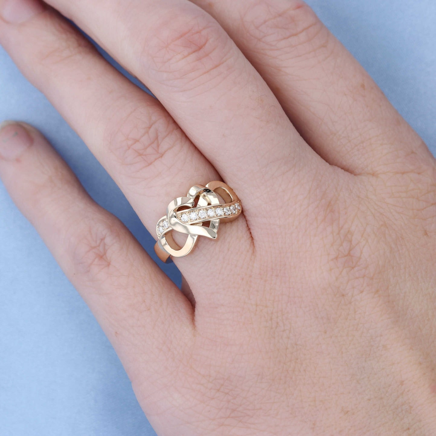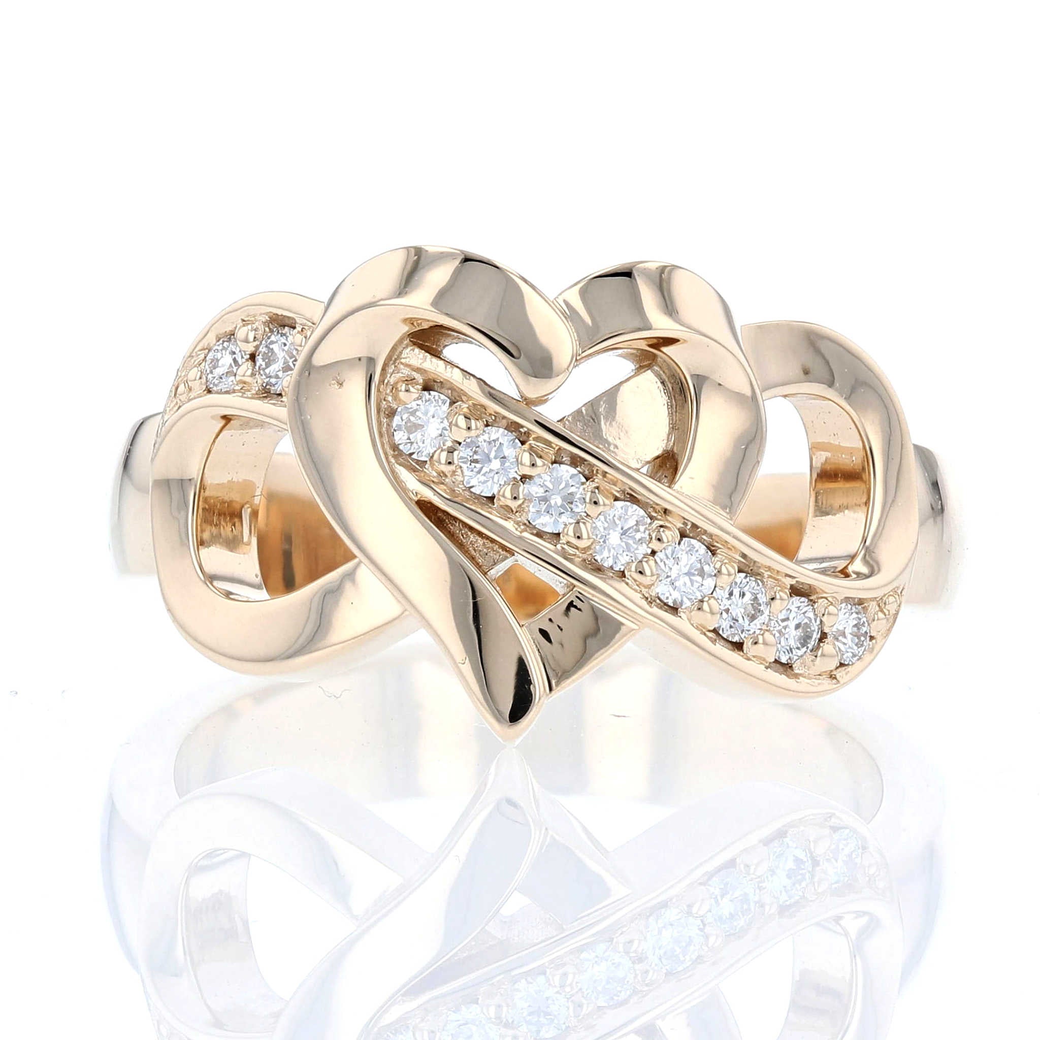 C139850Ribbons of gold weave together to form a heart interwoven with an infinity symbol, accented with a row of round brilliant cut diamonds, creating a ring that's full of meaning.