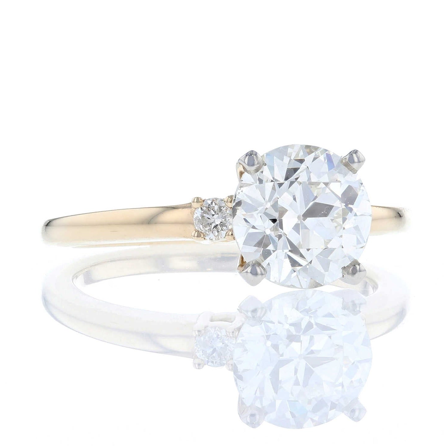 R123284This lovely three stone ring showcases an old European cut diamond in a white gold crown, accented with petite round diamonds in a yellow gold band.