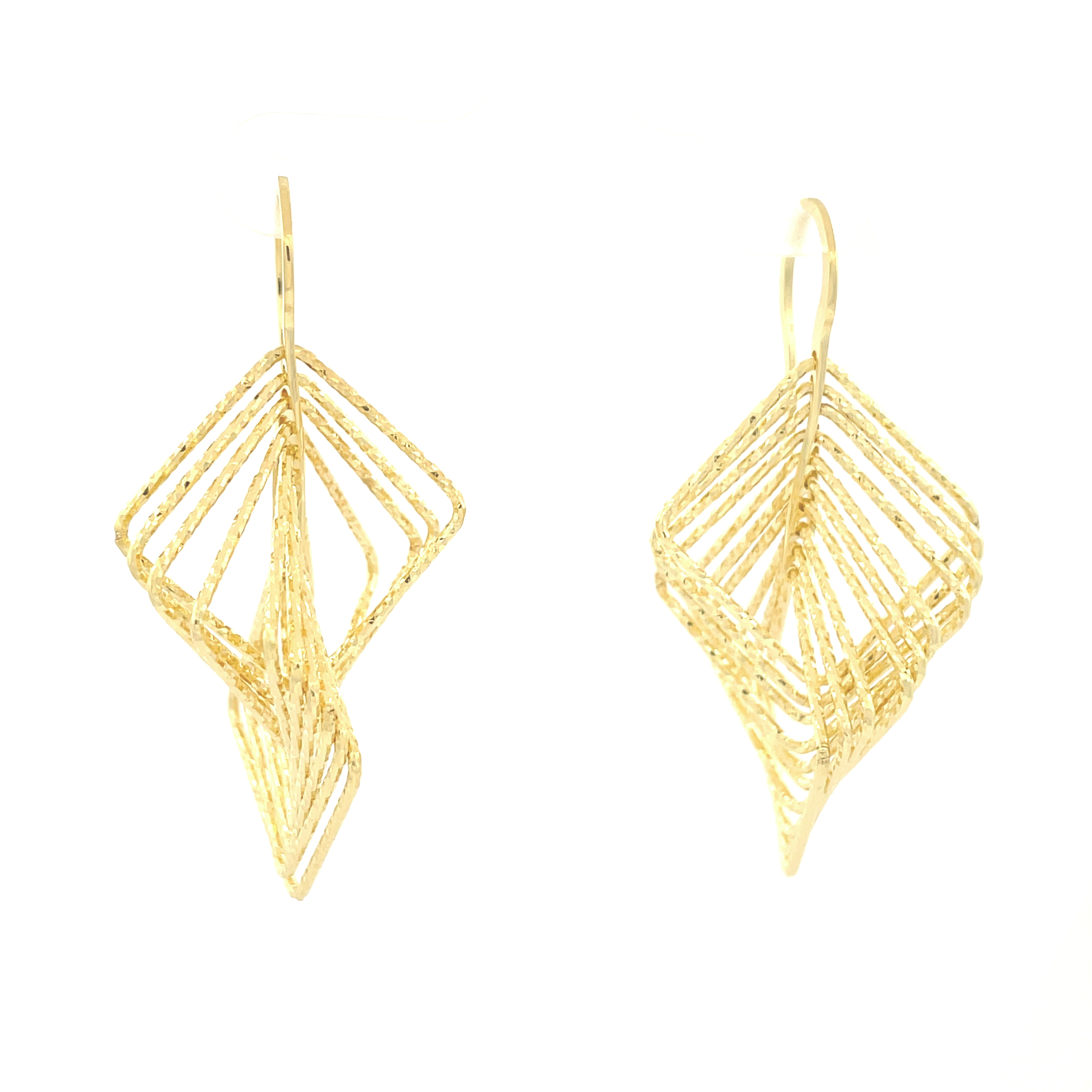 Yellow Gold Plated Sterling Silver 3-D Motion Diamond Cut Rectangle Dangle Earrings on Wire.