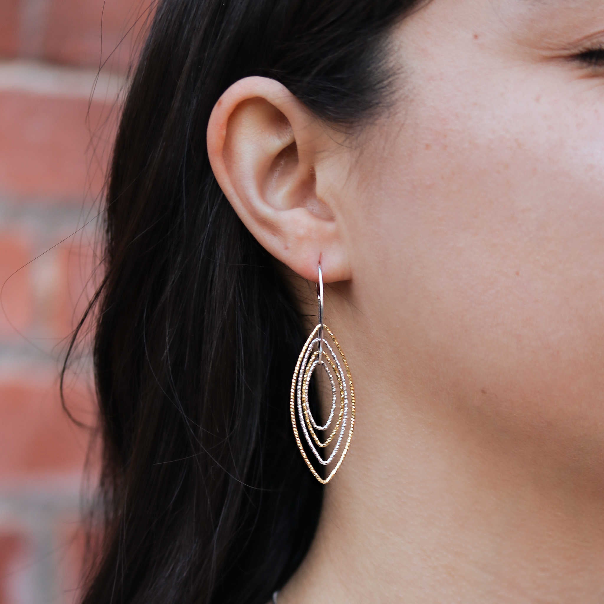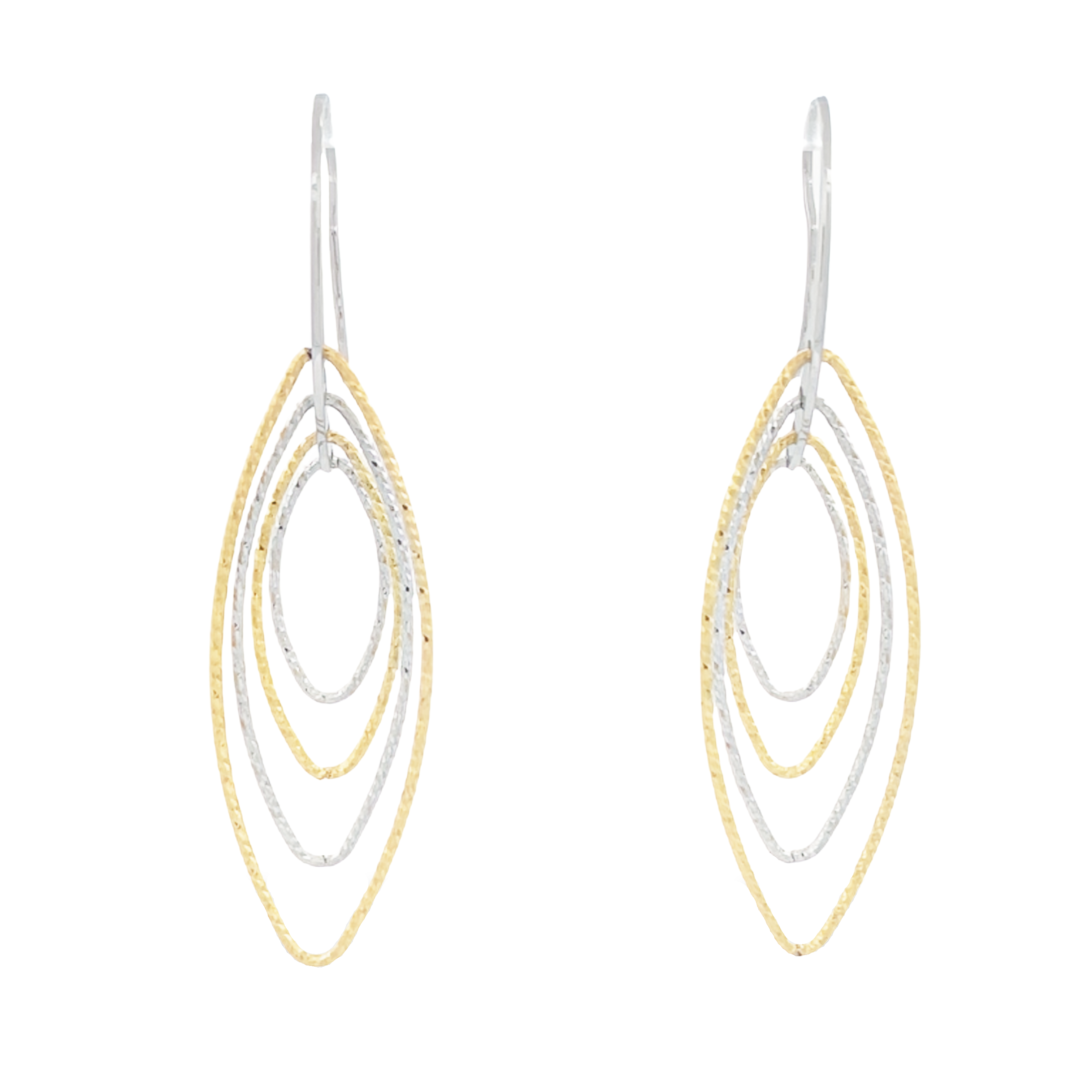 Yellow Gold Plated Sterling Silver & Sterling Silver 3-D Motion Diamond Cut Marquise Dangle Earrings on Wire.